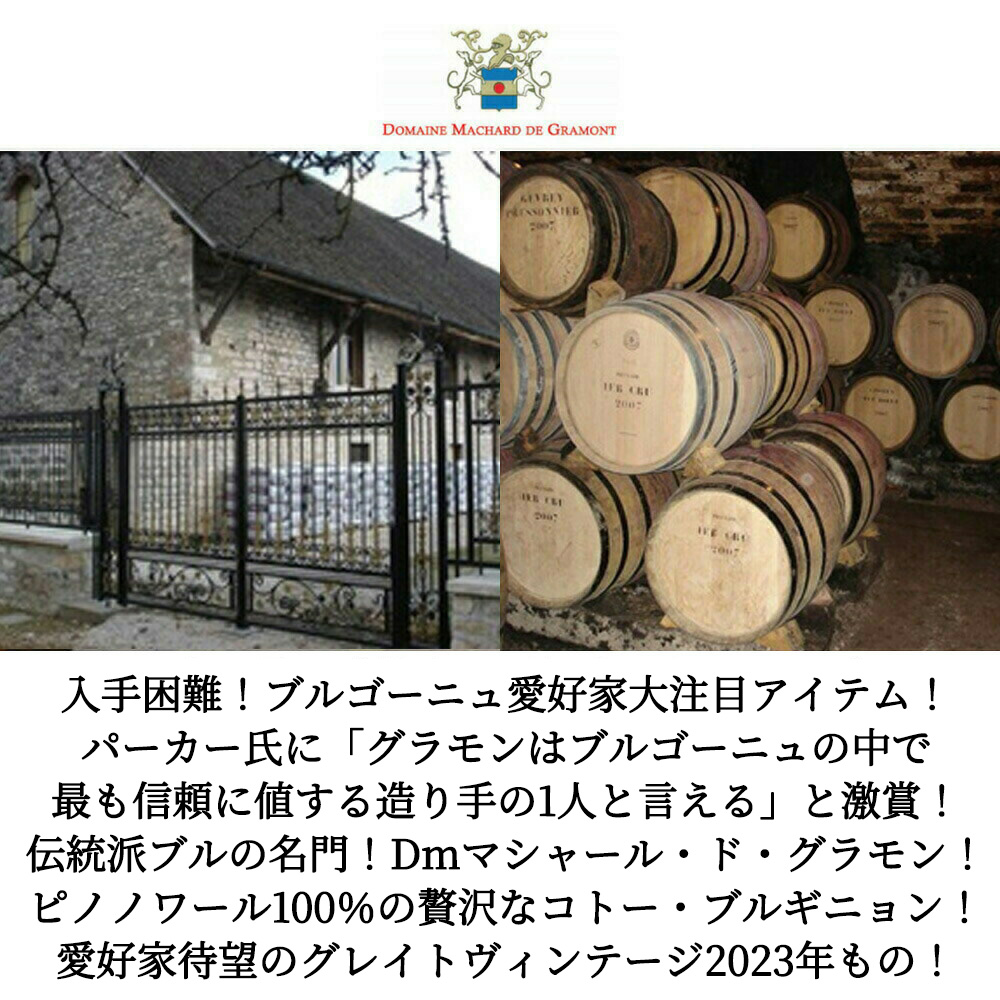 ル・クラスマン (現 レ・メイユール・ヴァン・ド・フランス) にユドロ・ノエラやラマルシュやラルロなどと同等の★ (シングルスター) 生産者に挙げさせ、「この特色がそのまま出たような素直な造りが特徴で、われわれは年ごとにその魅力に惹きつけられつつある」と絶賛させ、あのロバート・パーカー氏が「ドメーヌ・グラモンはブルゴーニュの中で最も信頼に値する造り手の一人と言える」と激賞!サザビーズのシニアディレクターでM.W.のセレナ・サトクリフ女史やゴーミヨ誌も大注目!RVF誌2024年版にいたってはアルマン・ルソーやメオ・カミュゼ、T・リジェベレール、グロフィエ、デュジャックに次ぐ★ (シングルスター) 生産者に挙げさせ、「この特色がそのまま出たような素直な造りが特徴で、われわれは年ごとにその魅力に惹きつけられつつある」と絶賛!の伝統派ブルゴーニュの名門!ドメーヌ・マシャール・ド・グラモンの元詰もの!