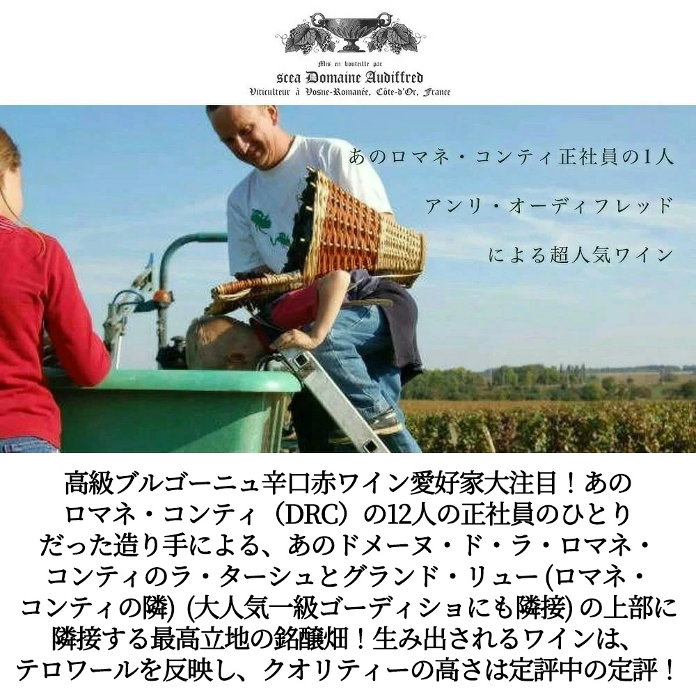 あのドメーヌ・ド・ラ・ロマネ・コンティのラ・ターシュとグランド・リュー (ロマネ・コンティの隣) (大人気一級ゴーディショにも隣接) の上部傾斜に隣接する最高立地の銘醸畑!生み出されるワインは、テロワールを反映し、クオリティーの高さは定評中の定評!しかも造り手は、あのロマネ・コンティ(DRC)の12人の正社員のひとりだったアンリ・オーディフレッドによる、18ヵ月樽熟、ヴォーヌ・ロマネの人気キュヴェ!しかもSPグレイトヴィンテージ[2023]年!過去、リアルワインガイド誌18号では「極めて正しいメンタリティを持った誠実な生産者が造る優しさと奥深さに満ちたハイクオリティなワイン」として特集記事!同誌22号では「各キュヴェとも生産本数は極めて少ない。人気アイテムの入手は容易ではないと思う。ゲットできる幸運を祈るしかないと思う」と大注目!