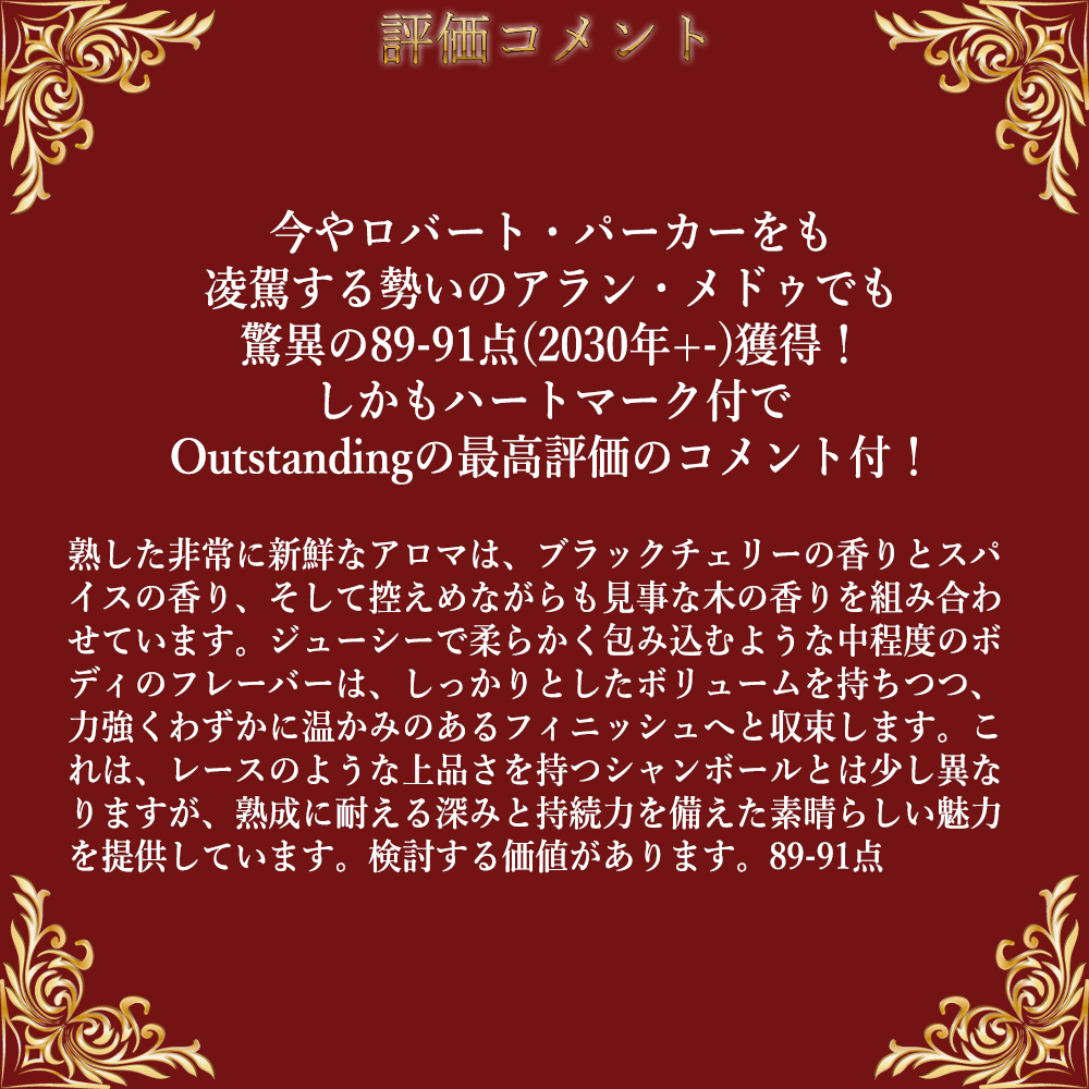 また今やロバート・パーカーをも凌駕する勢いのアラン・メドゥでも驚異の89-91点(2030年+-)獲得で『熟した非常に新鮮なアロマは、ブラックチェリーの香りとスパイスの香り、そして控えめながらも見事な木の香りを組み合わせています。ジューシーで柔らかく包み込むような中程度のボディのフレーバーは、しっかりとしたボリュームを持ちつつ、力強くわずかに温かみのあるフィニッシュへと収束します。これは、レースのような上品さを持つシャンボールとは少し異なりますが、熟成に耐える深みと持続力を備えた素晴らしい魅力を提供しています。検討する価値があります。89-91点』(2030年+-)と大絶賛!しかもハートマーク付でOutstandingの最高評価のコメント付!