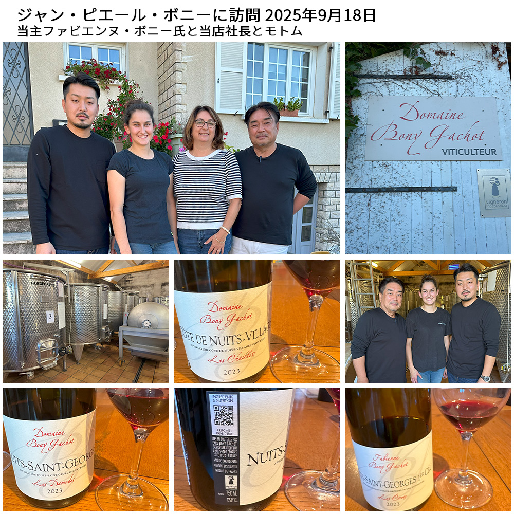 ドメーヌ・ボニー・ガショについてインポーターさんは「2019年ヴィンテージより、ドメーヌ名が「Jean-Pierre Bony」から「Bony Gachot」に変更になりました。1963年、ジャン・ピエール・ボニー氏がニュイ・サン・ジョルジュ村に創業したドメーヌで、以来ずっと生産量のほとんどをネゴシアンに販売してきました。しかし氏が2001年に急逝、それまで薬剤師をしていた娘のファビエンヌ・ボニーが急遽跡を継ぐことになり、ドラマが始まりました。ファビエンヌは、オーストラリアの複数のワイナリーで研修した後に一念発起、本格的に自社ビン詰めを開始しました。当初から「土を感じるとか、力強いとかではなく、それこそシャンボールのようにピュアで女性的なニュイ・サン・ジョルジュを造りたいのです」と確固たる信念を持っていた彼女は、この難題に何年間も挑戦し続けてきました。それは、幼い娘さんを3人抱えながらの、母としての戦いでもありました。そして、「当たり年だからこそ、生産量をあえて減らして質の追求に没頭した」2005年、ついに完成した「私の飲みたかったワイン」。それは、繊細で上品な、温故知新のニュイ・サン・ジョルジュでした。今日では、500人以上のフランスのワイン愛好家が彼女の新作を心待ちにしているほか、日本を皮切りにイギリス、イタリア、アメリカなどに輸出もはじまり、毎年予約で完売してしまうニュイ・サン・ジョルジュ随一の人気ドメーヌとなりました。」!創業はジャン=ピエール・ボニー氏によって始まり、その後2001年に彼の急逝を受けて妻のファビエンヌ・ボニーがドメーヌを引き継ぎました!2019年には、次世代の娘さんエヴァ・ガショが本格的に参画したことで、ドメーヌ名を「ボニー」から「ボニー・ガショ」へと改め、家族の新たな歩みを、母娘の体制でワイン造りを進めています!畑は主にニュイ=サン=ジョルジュやコルゴロワン周辺に位置し、ブルゴーニュらしい石灰質と粘土質の土壌がワインに繊細なミネラル感とエレガンスを与えています!彼女のワイン造りは、過度に抽出せず、果実味と酸のバランスを大切にした「ピュアで女性的なスタイル」と評されることが多く、伝統と現代的な感性を自然に融合させたもの!ボニー・ガショのワインは華やかさよりも、静かで誠実な味わいを大切にする造り手の哲学が反映されており、ブルゴーニュのピノ・ノワールを気負わず楽しみたい愛好家に支持されています!