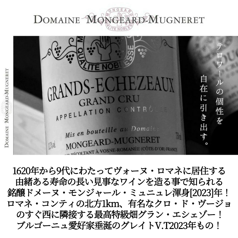 グラン・エシェゾーならではの驚くほど凝縮された果実のアロマ!溢れる男性的でスパイシーでコクのある最高のフルボディ辛口赤ワイン!ドメーヌ・モンジャール・ミュニュレの究極グラン・エシェゾーの特級が、大人気スーパーグレイトヴィンテージ[2023]年もので限定少量入荷!