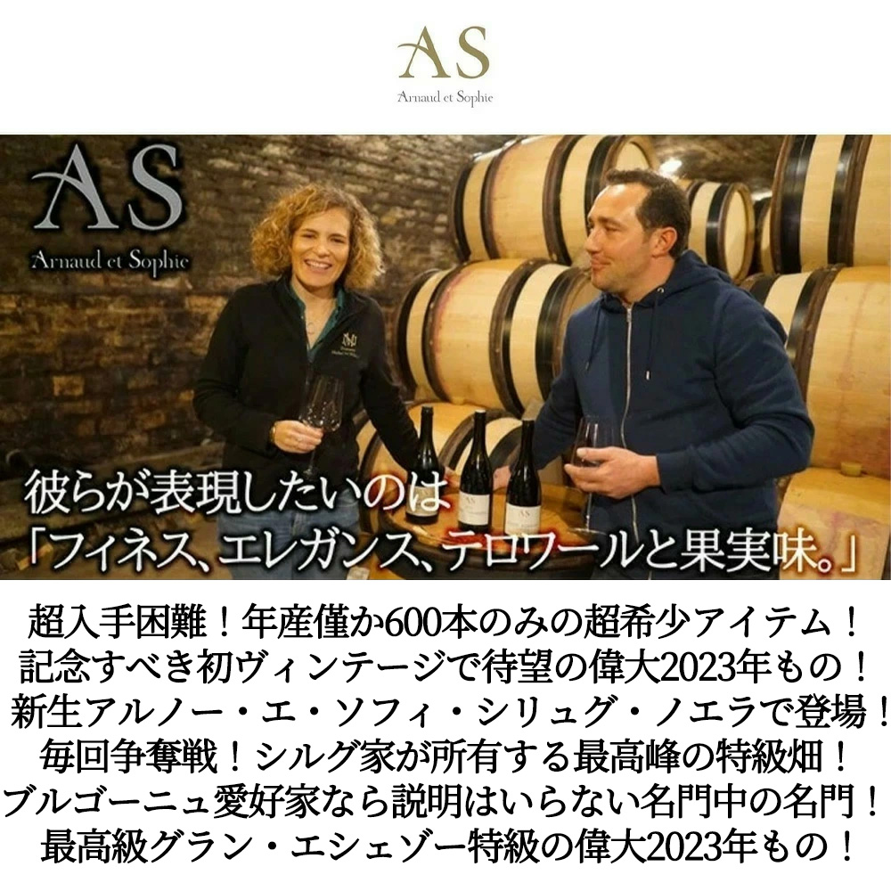 超入手困難!高級ブルゴーニュ辛口愛好家感涙!年産わずか600本のみ!ブルゴーニュ愛好家なら説明はいらないロベール・シリュグの究極グラン・エシェゾー・特級!毎回争奪戦の超人気アイテム!この2023年ヴィンテージから新生アルノー・エ・ソフィ・シリュグ・ノエラとして生まれ変わりました!日本にもアルノー・ソフィ夫妻が来日され、ワインの完成度の高さに愛好家の皆様も虜になられていました!しかも愛好家待望のスーパーグレイトヴィンテージ[2023]年(アシェット・ガイド誌2026年版でもブルゴーニュの赤に17/20点&RVF誌2026年版で驚異の95点の偉大な年)!