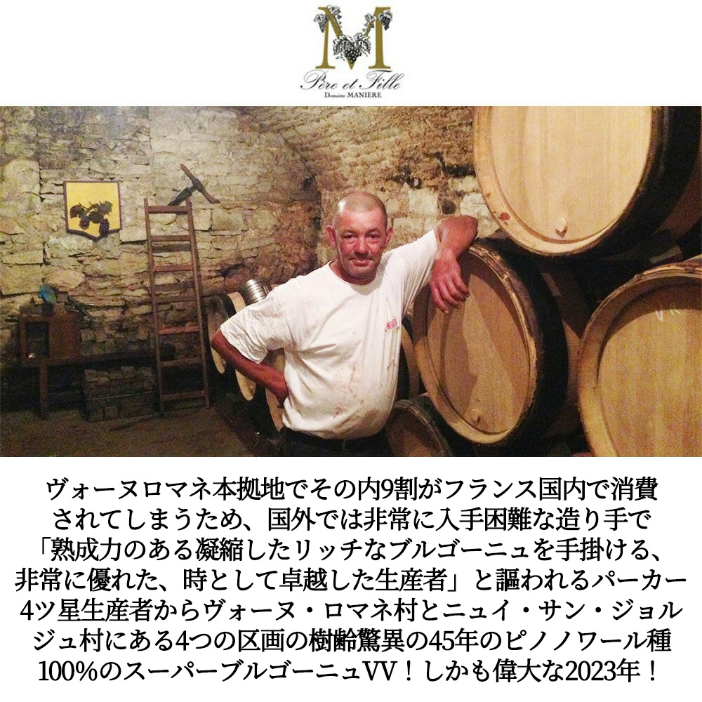 ブルゴーニュ・ピノ・ノワール[2023]年・ドメーヌ・マニエール・ペール・エ・フィーユ元詰・ヴォーヌ・ロマネとニュイ・サン・ジョルジュの村にある4つの区画の樹齢驚異の45年のピノノワール種100%・AOCブルゴーニュ・ルージュ・オーク樽(バリック)18ヶ月(新樽10%)熟成・14%