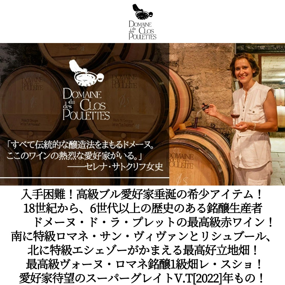 ヴォーヌ・ロマネ・プルミエ・クリュ・一級“レ・スショ”[2022]年・蔵出し限定品・ドメーヌ・ド・ラ・プレット元詰(プーレット)・AOCヴォーヌ・ロマネ・プルミエ・クリュ・一級