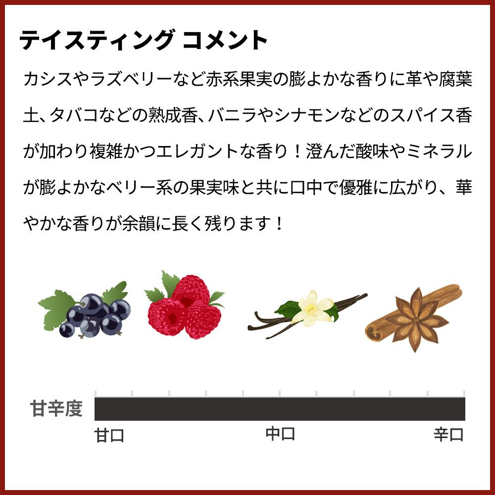 カシスやラズベリーなど赤系果実の膨よかな香りに革や腐葉土、タバコなどの熟成香、バニラやシナモンなどのスパイス香が加わり複雑かつエレガントな香り!澄んだ酸味やミネラルが膨よかなベリー系の果実味と共に口中で優雅に広がり、華やかな香りが余韻に長く残ります!