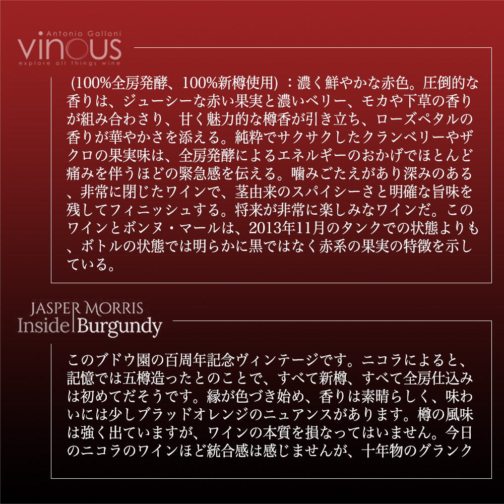 ヴィノス誌驚異の95点+絶賛コメントは『 (100%全房発酵、100%新樽使用) :濃く鮮やかな赤色。圧倒的な香りは、ジューシーな赤い果実と濃いベリー、モカや下草の香りが組み合わさり、甘く魅力的な樽香が引き立ち、ローズペタルの香りが華やかさを添える。純粋でサクサクしたクランベリーやザクロの果実味は、全房発酵によるエネルギーのおかげでほとんど痛みを伴うほどの緊急感を伝える。噛みごたえがあり深みのある、非常に閉じたワインで、茎由来のスパイシーさと明確な旨味を残してフィニッシュする。将来が非常に楽しみなワインだ。このワインとボンヌ・マールは、2013年11月のタンクでの状態よりも、ボトルの状態では明らかに黒ではなく赤系の果実の特徴を示している。 (ST) 95+』と大絶賛!