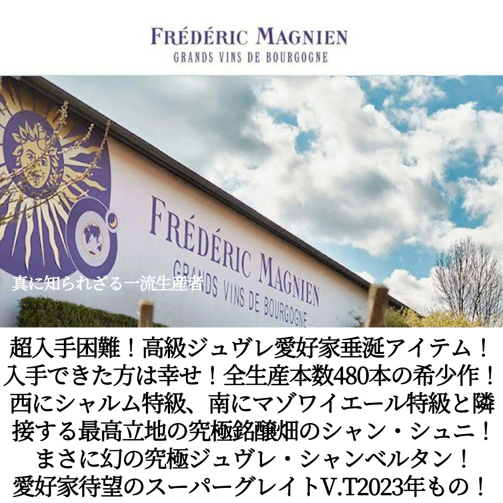 ジュヴレ・シャンベルタン・シャン・シュニ(シェニ)・アンフォラ(ジャー)熟成[2023]年・超限定輸入品・オーク樽15ヶ月熟成・ フレデリック・マニャン・わずか0.15haの単一区画畑からの年産わずか480本のみ・平均樹齢50年・(なんと3分の1が1930年植樹の86年樹齢のV.V)のピノ・ノワール100%・自然派ビオ・ディナミ(AB認証)・正規代理店輸入品