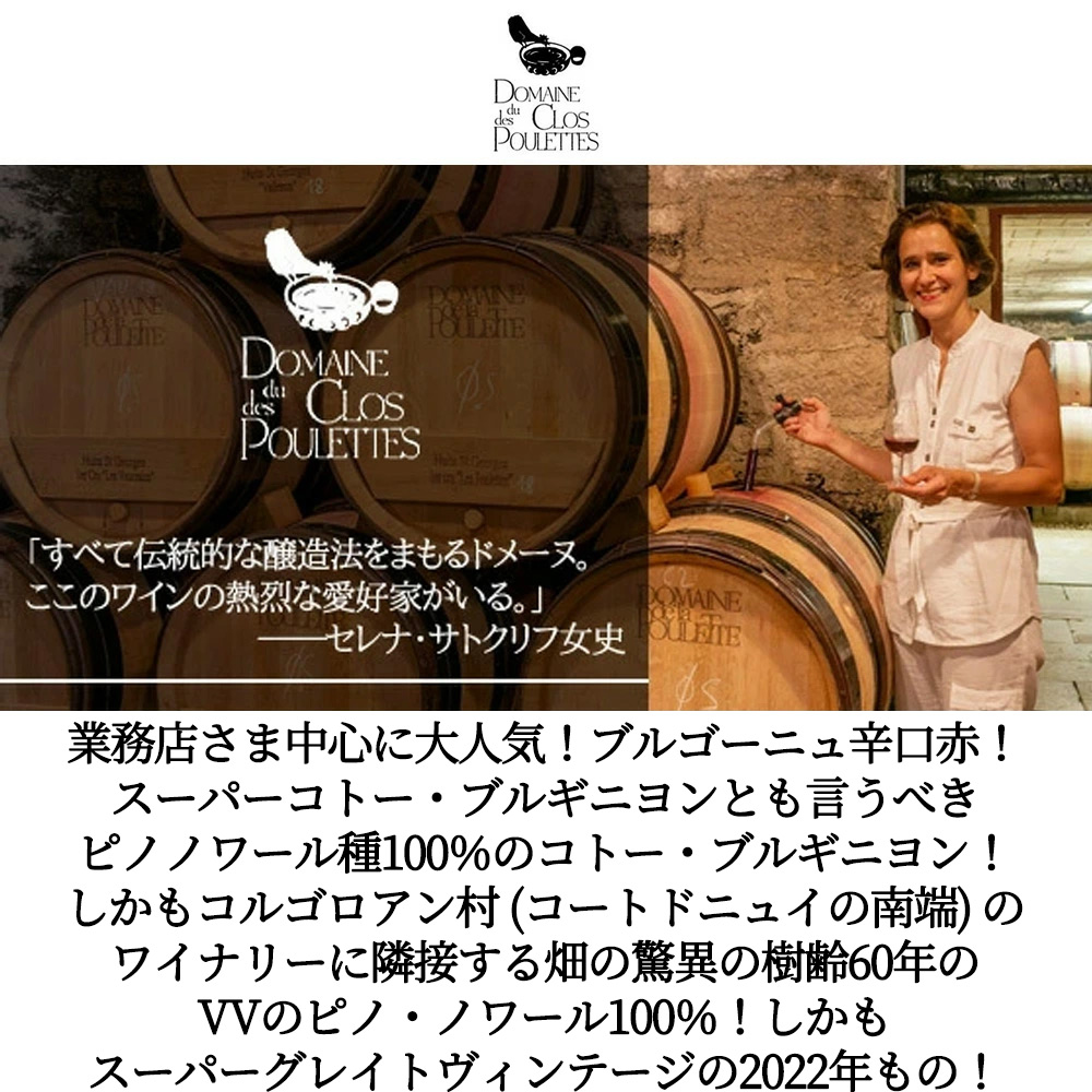 コトー・ブルギニヨン[2022]年・蔵出し限定作品・ドメーヌ ド ラ プレット元詰・(コルゴロアン村(コートドニュイの南端)のワイナリーに隣接する樹齢驚異の60年以上の畑のピノ・ノワールを100%使用)・旧フレンチオークのフードルにて18ヶ月熟成・AOCコトー・ブルギニヨン