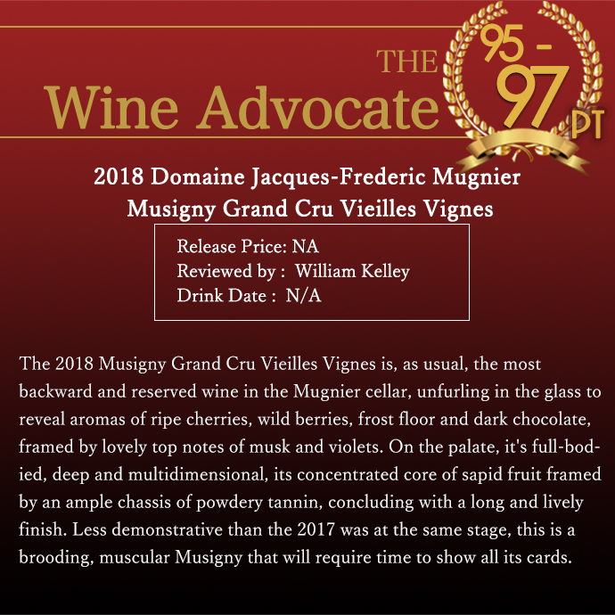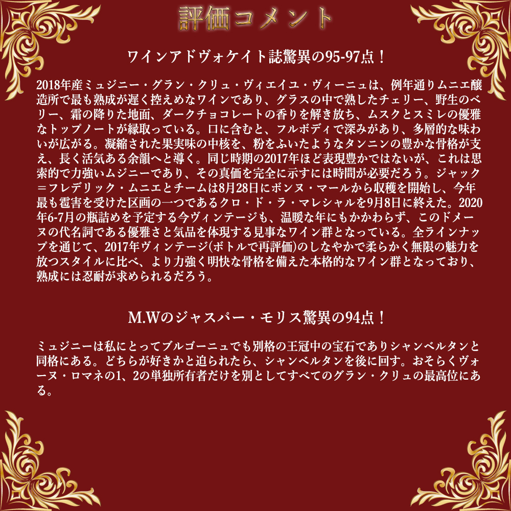 ミュジニー・グラン・クリュ・特級・ヴィエイユ・ヴィーニュ[2018]年・蔵出し限定品・ドメーヌ・ジャック・フレデリック・ミュニエ元詰・AOCミュジニー・グラン・クリュ・特級・ワインアドヴォケイト誌驚異の95-97点&バーガウンド94-96点