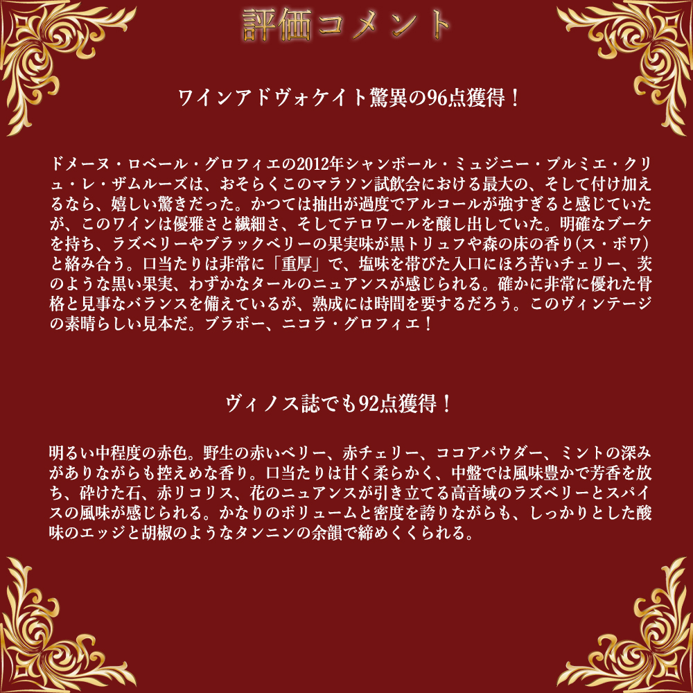 この2012年にワインアドヴォケイト驚異の96点でコメントは「ドメーヌ・ロベール・グロフィエの2012年シャンボール・ミュジニー・プルミエ・クリュ・レ・ザムルーズは、おそらくこのマラソン試飲会における最大の、そして付け加えるなら、嬉しい驚きだった。かつては抽出が過度でアルコールが強すぎると感じていたが、このワインは優雅さと繊細さ、そしてテロワールを醸し出していた。明確なブーケを持ち、ラズベリーやブラックベリーの果実味が黒トリュフや森の床の香り(ス・ボワ)と絡み合う。口当たりは非常に「重厚」で、塩味を帯びた入口にほろ苦いチェリー、茨のような黒い果実、わずかなタールのニュアンスが感じられる。確かに非常に優れた骨格と見事なバランスを備えているが、熟成には時間を要するだろう。このヴィンテージの素晴らしい見本だ。ブラボー、ニコラ・グロフィエ!」と激賞!