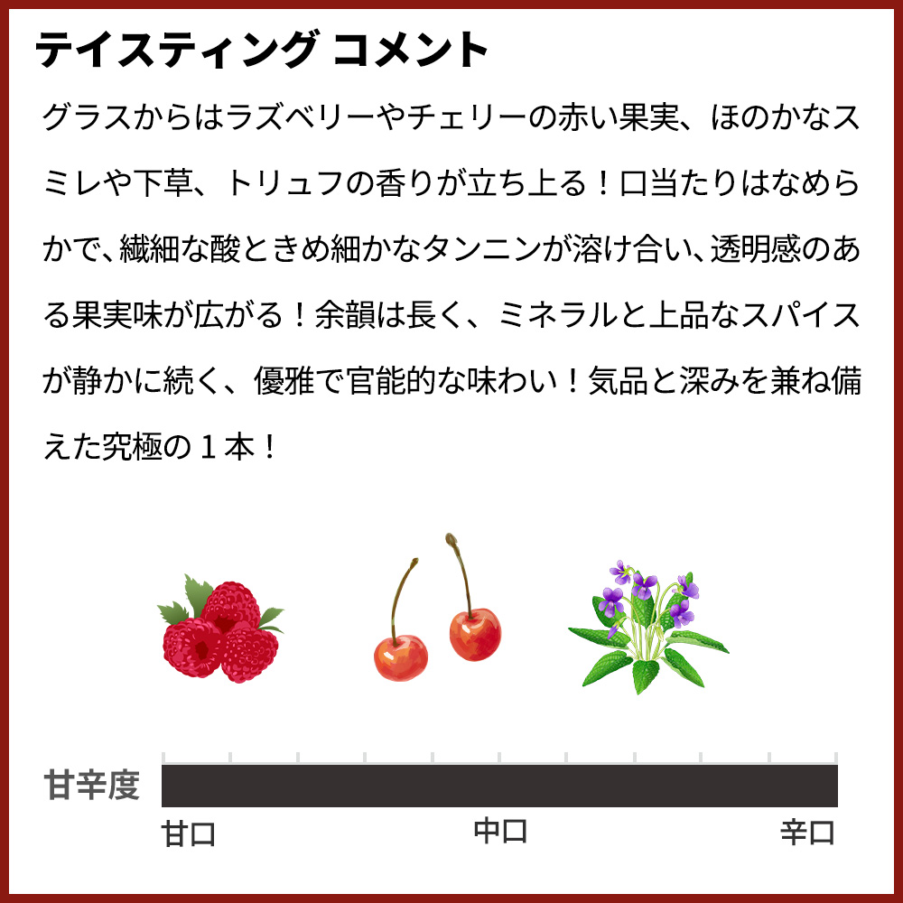 グラスからはラズベリーやチェリーの赤い果実、ほのかなスミレや下草、トリュフの香りが立ち上る!口当たりはなめらかで、繊細な酸ときめ細かなタンニンが溶け合い、透明感のある果実味が広がる!余韻は長く、ミネラルと上品なスパイスが静かに続く、優雅で官能的な味わい!気品と深みを兼ね備えた究極の1本!銘醸ロベール・グロフィエの最高峰シャンボール銘醸1級レ・ザムルーズ!しかも今や非常に希少な飲み頃14年熟成のグレイトヴィンテージ[2012]年ものが正規品で限定で少量入荷!