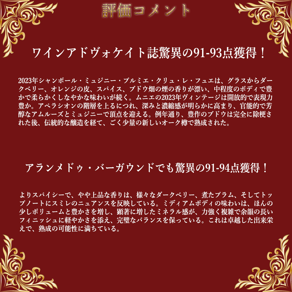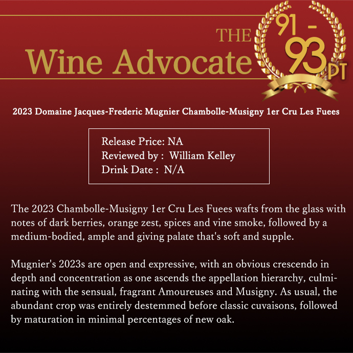 この2023年でワインアドヴォケイト誌驚異の91-93点でコメントは「2023年シャンボール・ミュジニー・プルミエ・クリュ・レ・フュエは、グラスからダークベリー、オレンジの皮、スパイス、ブドウ畑の煙の香りが漂い、中程度のボディで豊かで柔らかくしなやかな味わいが続く。ムニエの2023年ヴィンテージは開放的で表現力豊か。アペラシオンの階層を上るにつれ、深みと濃縮感が明らかに高まり、官能的で芳醇なアムルーズとミュジニーで頂点を迎える。例年通り、豊作のブドウは完全に除梗された後、伝統的な醸造を経て、ごく少量の新しいオーク樽で熟成された。」と大注目!