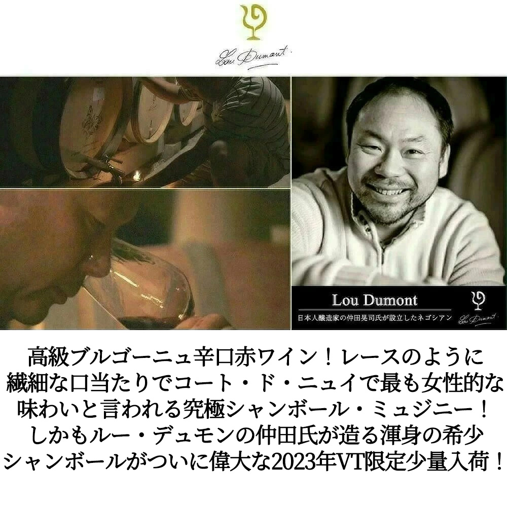 入手困難!高級ブルゴーニュ辛口赤ワイン愛好家大注目!高級シャンボール・ミュジニー愛好家大注目!レースのように繊細な口当たりでコート・ド・ニュイで最も女性的な味わいと言われる究極シャンボール・ミュジニー!しかもルー・デュモンの仲田氏が造るシャンボールミュジニーの大人気の最新グレイトヴィンテージの[2023]年もの(RVF誌2026年版でも驚異の95点の高評価)仲田さんの渾身[2023]年産の希少シャンボールがついに偉大な2023年ヴィンテージ!でついに少量入荷!
