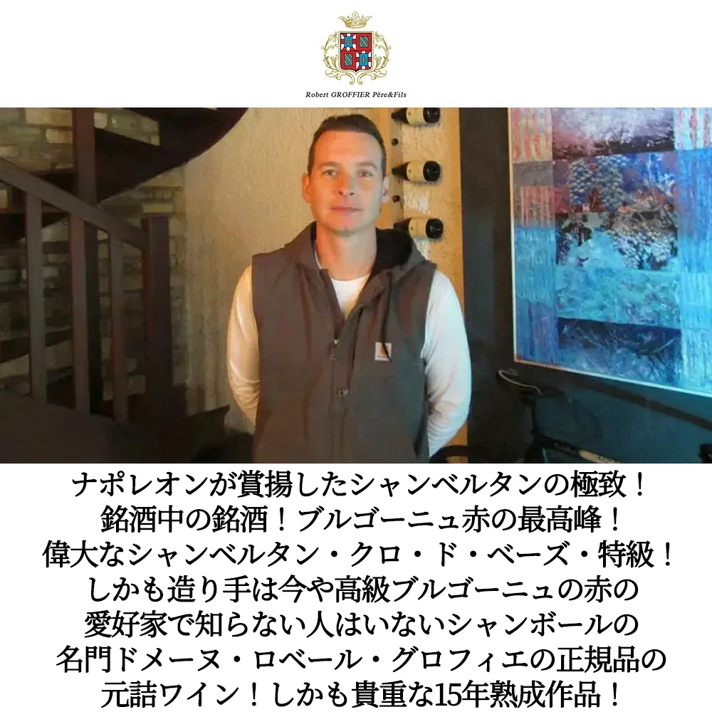 しかも造り手は今や高級ブルゴーニュの赤の愛好家で知らない愛好家はいないシャンボール=ミュジニーの名門で、レ・ザムルーズ最大所有者としても知られるドメーヌ・ロベール・グロフィエ・ペール・エ・フィスの正規品の元詰ワイン!レ・ザムルーズ最大の所有者が造る、果実味豊かでシルキーな喉越しの赤ワイン!シャンベルタン・クロ・ド・ベーズはジュヴレ=シャンベルタン村の特級畑で、筋肉質なストラクチャーと力強さを持つ区画として位置づけられますがグロフィエのクロ・ド・ベーズ特級はシャンベルタンらしい骨格はしっかりしつつも、タンニンはきめ細かく、滑らかでしなやかなタッチで有名!造り手のコメントではボンヌ・マール特級よりミネラルが強いとコメントしており、余韻にスパイシーさとミネラル感が長く残るタイプとされています!