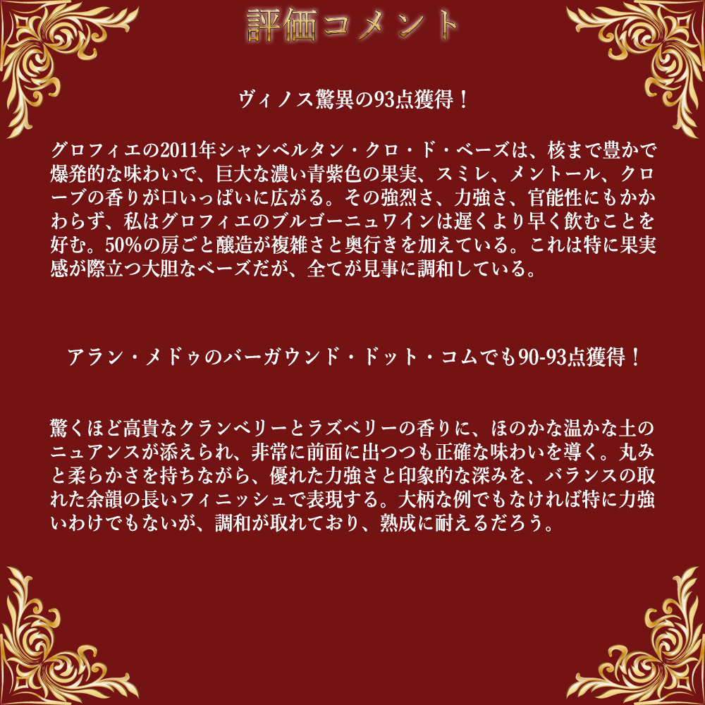 ヴィノス驚異の93点で絶賛コメントは『グロフィエの2011年シャンベルタン・クロ・ド・ベーズは、核まで豊かで爆発的な味わいで、巨大な濃い青紫色の果実、スミレ、メントール、クローブの香りが口いっぱいに広がる。その強烈さ、力強さ、官能性にもかかわらず、私はグロフィエのブルゴーニュワインは遅くより早く飲むことを好む。50%の房ごと醸造が複雑さと奥行きを加えている。これは特に果実感が際立つ大胆なベーズだが、全てが見事に調和している。』と大注目!