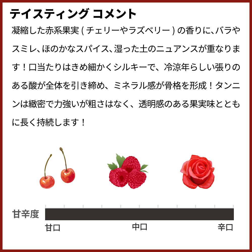 凝縮した赤系果実(チェリーやラズベリー)の香りに、バラやスミレ、ほのかなスパイス、湿った土のニュアンスが重なります!口当たりはきめ細かくシルキーで、冷涼年らしい張りのある酸が全体を引き締め、ミネラル感が骨格を形成!タンニンは緻密で力強いが粗さはなく、透明感のある果実味とともに長く持続します!余韻には上品な甘やかさとほのかな苦みが調和し、熟成によりさらに複雑味を増した最高峰シャンベルタン・クロ・ド・ベーズ特級!