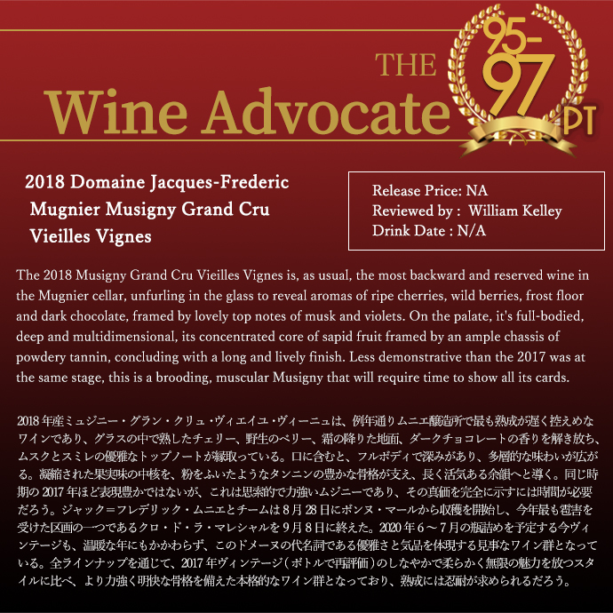 この[2018]年でワインアドヴォケイト誌驚異の95-97点!コメントは「2018年産ミュジニー・グラン・クリュ・ヴィエイユ・ヴィーニュは、例年通りムニエ醸造所で最も熟成が遅く控えめなワインであり、グラスの中で熟したチェリー、野生のベリー、霜の降りた地面、ダークチョコレートの香りを解き放ち、ムスクとスミレの優雅なトップノートが縁取っている。口に含むと、フルボディで深みがあり、多層的な味わいが広がる。凝縮された果実味の中核を、粉をふいたようなタンニンの豊かな骨格が支え、長く活気ある余韻へと導く。同じ時期の2017年ほど表現豊かではないが、これは思索的で力強いムジニーであり、その真価を完全に示すには時間が必要だろう。ジャック=フレデリック・ムニエとチームは8月28日にボンヌ・マールから収穫を開始し、今年最も雹害を受けた区画の一つであるクロ・ド・ラ・マレシャルを9月8日に終えた。2020年6~7月の瓶詰めを予定する今ヴィンテージも、温暖な年にもかかわらず、このドメーヌの代名詞である優雅さと気品を体現する見事なワイン群となっている。全ラインナップを通じて、2017年ヴィンテージ (ボトルで再評価) のしなやかで柔らかく無限の魅力を放つスタイルに比べ、より力強く明快な骨格を備えた本格的なワイン群となっており、熟成には忍耐が求められるだろう。」と大注目!