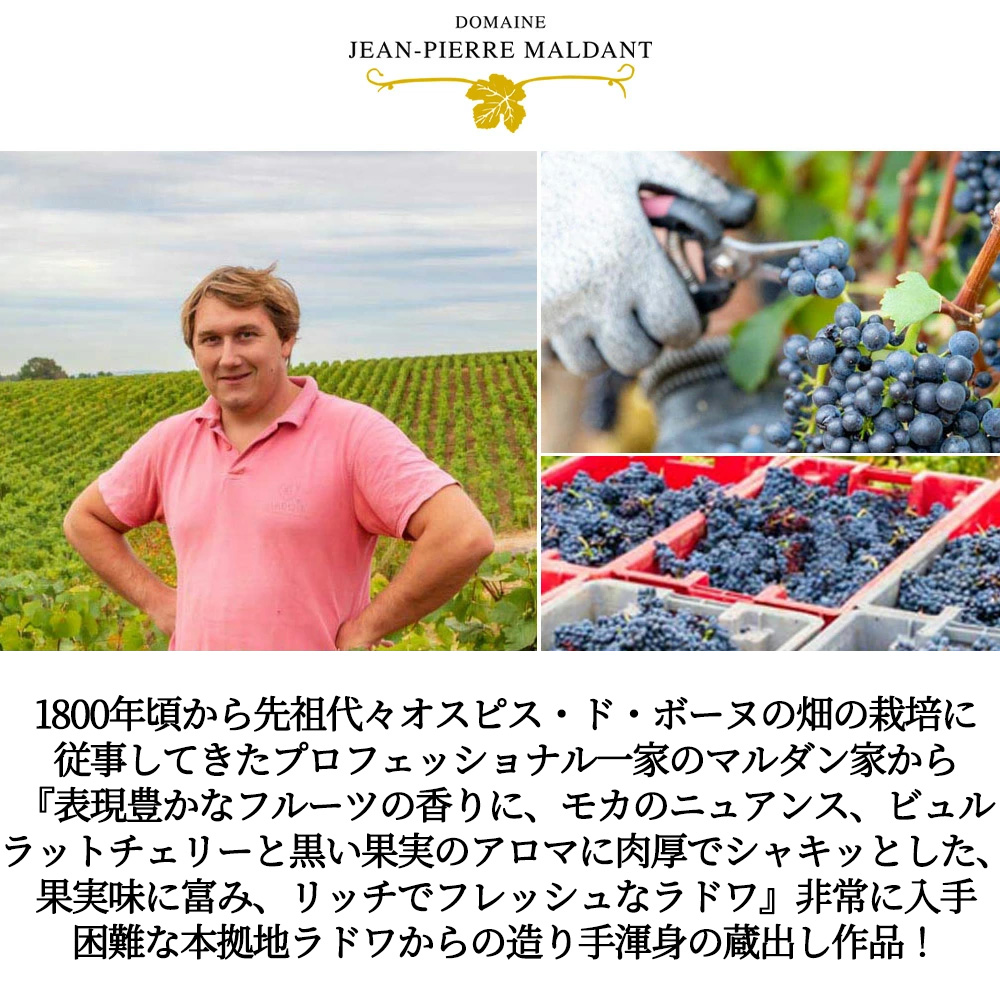しかも造り手は、そのほとんどがフランスのレストランやワインショップ、ビストロに直行!日本では非常に珍しい造り手!(しかもフランスワイン権威評価誌アシェット・ガイド誌2022年版でWスター★★筆頭に3作品が掲載の快挙!(2012年版以降ほぼ毎年連続掲載!)大注目!連続掲載!ブルゴーニュ・オージュルデュイ誌大注目!)でラドワ・セリニ村に1895年創業!120年に及ぶ長い歴史を持つ家族経営の名門ぶどう栽培家!で、しかも1800年代から先祖代々!200年近く、あのオスピス・ド・ボーヌの畑の栽培に従事してきたプロフェッショナル一家で、2010年からは、4代目ジャン・ピエール・マルダンの息子で、5代目ピエール・フランソワの新世代になって、人気も品質も急上昇!各ワイン誌大絶賛!