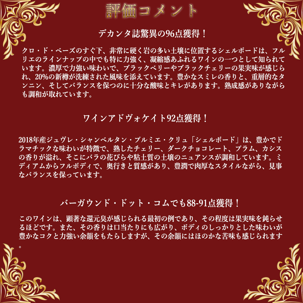 ワインアドヴォケイト92点でコメントは「2018年産ジュヴレ・シャンベルタン・プルミエ・クリュ「シェルボード」は、豊かでドラマチックな味わいが特徴で、熟したチェリー、ダークチョコレート、プラム、カシスの香りが溢れ、そこにバラの花びらや粘土質の土壌のニュアンスが調和しています。ミディアムからフルボディで、奥行きと質感があり、豊潤で肉厚なスタイルながら、見事なバランスを保っています。」!
