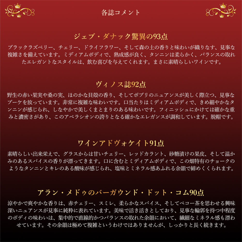 今やパーカーをも凌駕する勢いのアラン・メドゥのバーガウンド・ドット・コムでも90点高評価でコメントは「涼やかで爽やかな香りは、赤チェリー、スミレ、柔らかなスパイス、そしてペコー茶を思わせる興味深いニュアンスが見事に純粋に表れています。美味で活き活きとしており、見事な輪郭を持つ中程度のボディの味わいは、集中的で直線的かつバランスの取れた余韻において、繊細なミネラル感も漂わせています。その余韻は極めて複雑というわけではありませんが、しっかりと長く続きます。」とOutstandingの高評価!