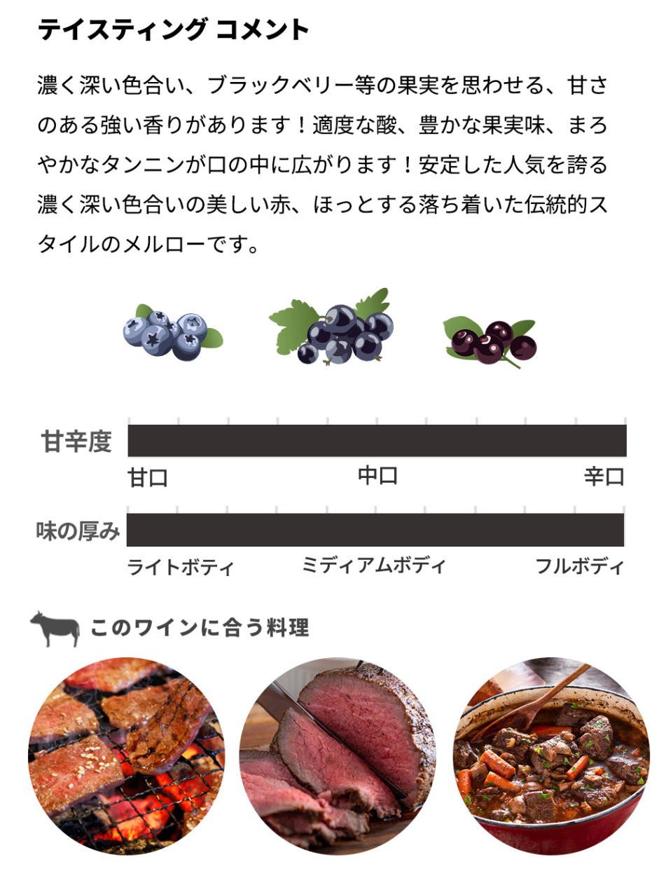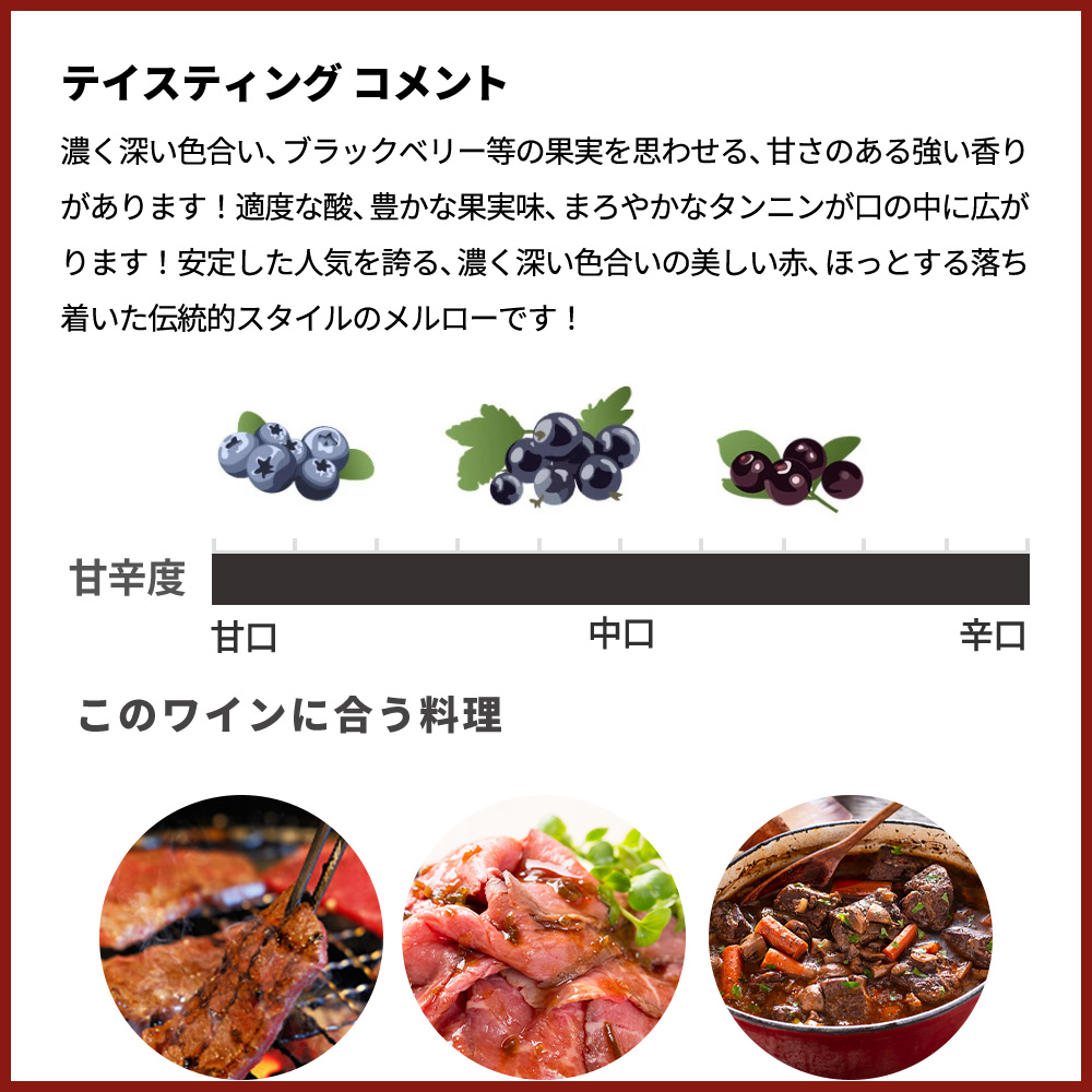 濃く深い色合い、ブラックベリー等の果実を思わせる、甘さのある強い香りがあります!適度な酸、豊かな果実味、まろやかなタンニンが口の中に広がります!安定した人気を誇る、濃く深い色合いの美しい赤、ほっとする落ち着いた伝統的スタイルのメルローが限定で少量入荷!