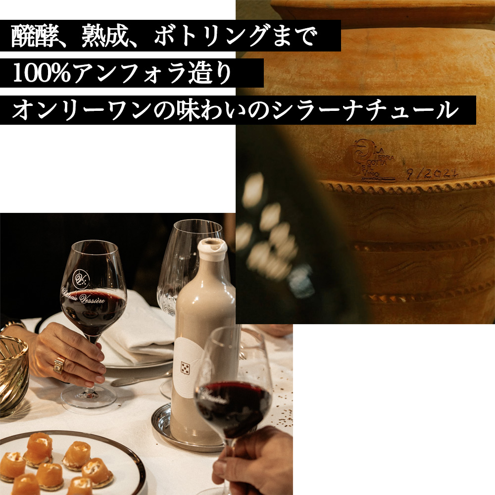 醗酵、熟成、ボトリングまで100%アンフォラ造りオンリーワンの味わいのシラーナチュール (ビオディナミ (demeter) 、ビオロジック (AB:Agriculture Biologique) 、オーガニック (Euro Leaf) ) !しかも平均樹齢驚異の50年!粘土石灰質の下層土に、丸い小石混じりの表土!アンフォラ (素焼き壺) でマセラシオン、天然酵母を使用し、アルコール醗酵とマロラクティック醗酵を行います!その後、アンフォラで5ヶ月間熟成!さらに、アンフォラのボトルで熟成を重ねます!アンフォラ以外を使用しない、完全なる古代アンフォラナチュールです!限定生産1,000-1300本!造り手のシャトー・ヴェシエールは古代ワイン産地コスティエール・ド・ニーム、カマルグのすぐそばに位置し、7世代にわたりワイン造り続けてきました!2007年以来、ヴィンセントとルーシーのトゥロン夫妻が葡萄園の経営を引き継いでいます!2011年にユーロリーフ認証を取得し、2019年ビオディナミに転換、現在はデメテール認証の下でワインを生産しています!害虫や病気の自然な防除方法、エネルギーの自給自足、プレパラシオン、特に亜硫酸塩の投入量の削減など、伝統と自然への深い敬意を反映しており、この地域のテロワールを表現しています!