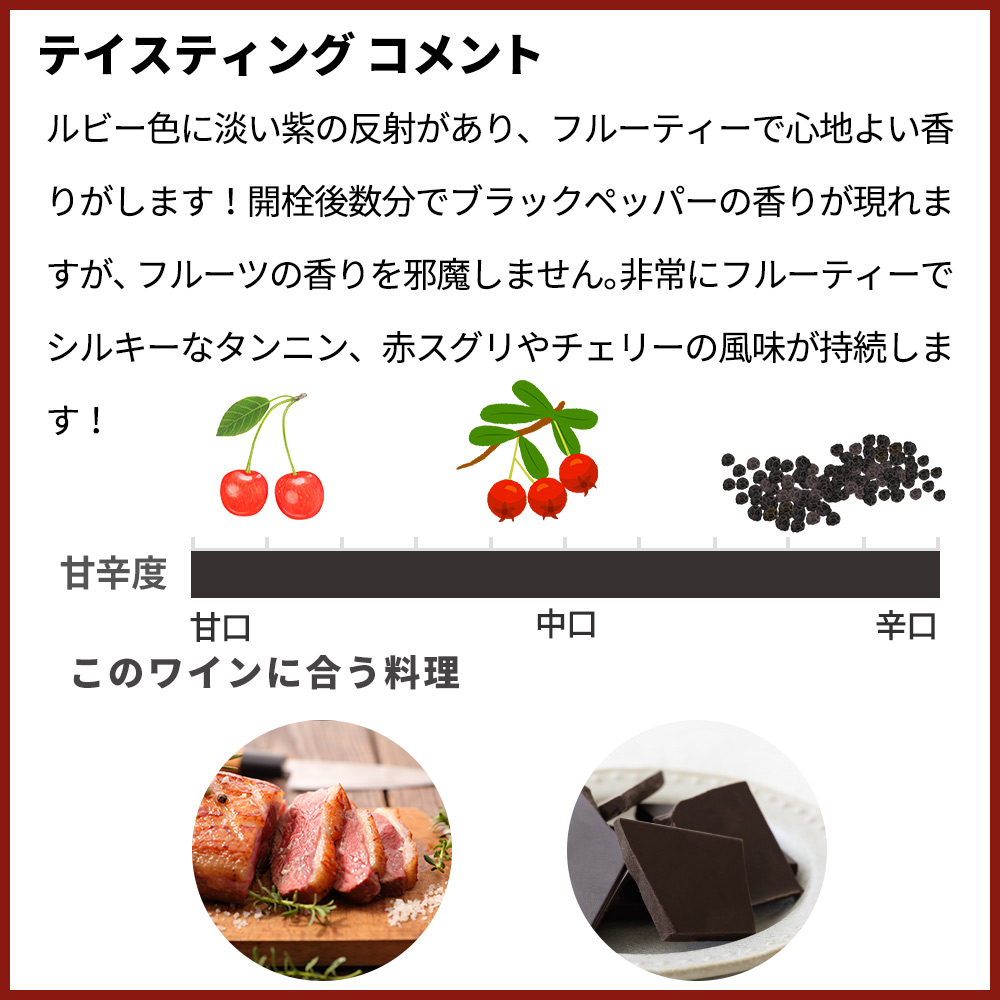 100%アンフォラ造りにより、今まで味わったことのないようなエレガントなシラーが楽しめます!牛肉、ラム肉、鴨のグリルと好相性で、チョコレート好きの方にはダークチョコレートとのペアリングが格別です!10-15°Cの安定した温度で保存し、わずかに冷やすことでテクスチャーと果実味がより一層引き立ちます!