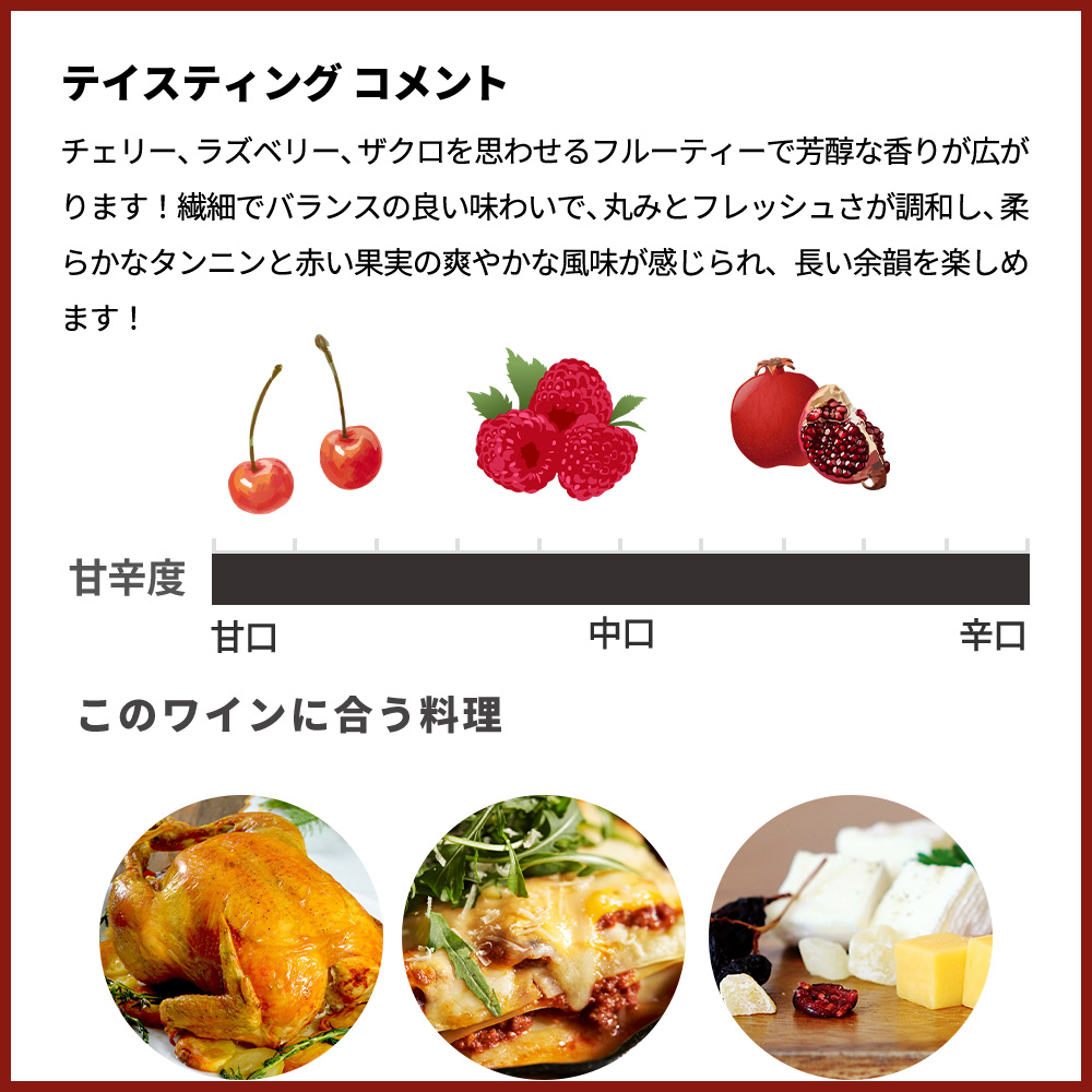 チェリーレッドの色合い!チェリー、ラズベリー、ザクロを思わせるフルーティーで芳醇な香りが広がります!繊細でバランスの良い味わいで、丸みとフレッシュさが調和し、柔らかなタンニンと赤い果実の爽やかな風味が感じられ、長い余韻を楽しめます!ローストチキンやハーブグリルのラムチョップ、野菜のラザニア、ペンネ・アラビアータといった料理にぴったりです!また、シャルキュトリーやチーズの盛り合わせ、デザートにはダークチョコレートブラウニーとも美しく調和します!可愛いラベルの渋み控えめで果実味豊かなさわやかな飲み口はカフェバー様やバル様にも超おすすめです!