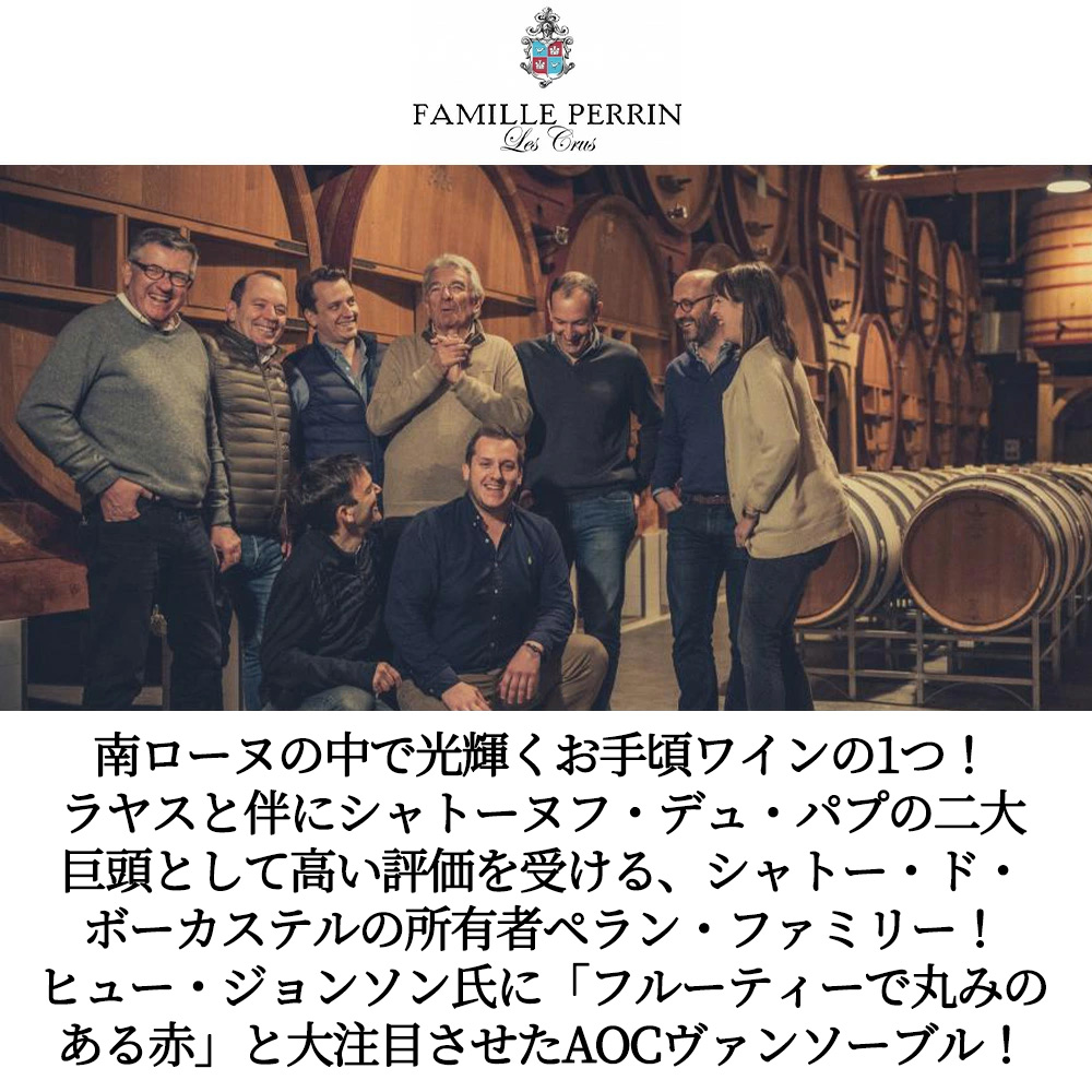 造り手は、ラヤスと伴にシャトーヌフ・デュ・パプの二大巨頭として高い評価! (ほとんどの評価誌が満点生産者に挙げ、ほとんどのワインライターがこの生産者のトップワインに挙げる) を受ける、シャトー・ド・ボーカステルの所有者ペラン・ファミリー!南ローヌの主要アペラシオンに300ha以上の畑を所有し、個々の品種が最も適したテロワールを見極め、古くからオーガニック栽培を実践!時代とともに革新を続けながらも「ワインは自然の力だけで造るもの」というポリシーを貫くファミーユ・ペランによる超人気ヴァンソーブル!2022年でジェームス・サックリング驚異の91点でコメントは「しっかりとした造りで、味わい深い赤ワイン。甘いチェリーや赤いベリー、甘い焼き菓子のスパイスの香りが感じられます。ミディアムボディで、熟した繊細なタンニンが特徴です。洗練された口当たりで、豊かな果実味と、鮮やかな余韻に漂う魅力的なオレンジピールのニュアンスが楽しめます。」と大注目!