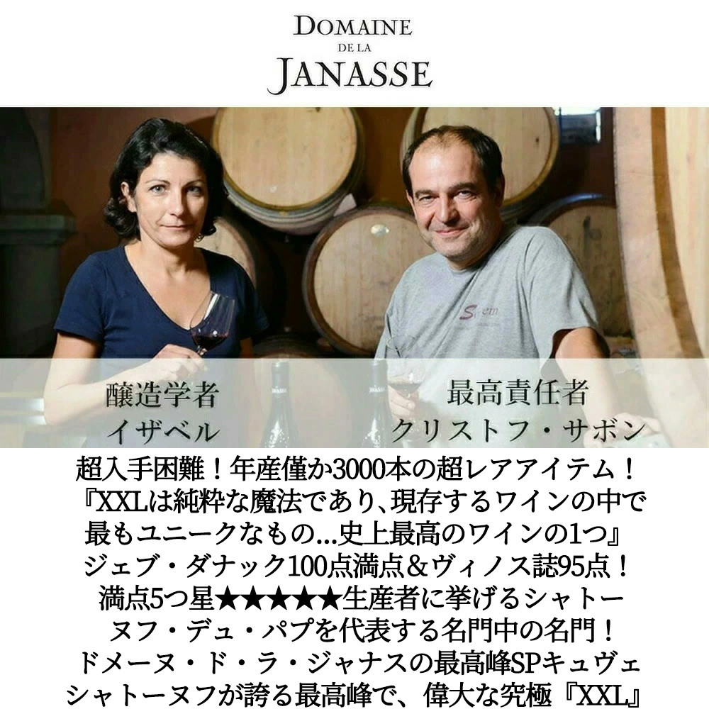 ヴィノス誌95点でコメントは「ドメーヌ・ド・ラ・ジャナスのシャトーヌフ・デュ・パプXXLは、2007年の初ヴィンテージと続く2016年に続き、2019年がわずか3度目の瓶詰めとなった。主に古木のグルナッシュを主体とし、少量のムールヴェードル及びその他の認可品種をブレンドしている。グルナッシュは2年間フーダーで熟成され、ムールヴェードルはフランス産オーク樽(新樽比率少)で短期間熟成された。中程度のルビー色。グラスからはジャム状の赤・黒系果実、甘草、ガリーグ(地中海沿岸の低木地帯)、熟成肉、クローブ、そしてほのかなバーボンバニラの香りが強く立ち上る。フルボディで圧倒的な濃縮感と力強さを持ち、その巨大なパワーをスタイルをもって表現している。まるでテーラーメイドのスーツを着たボディビルダーのようだ。生産本数はわずか3,000本。」!