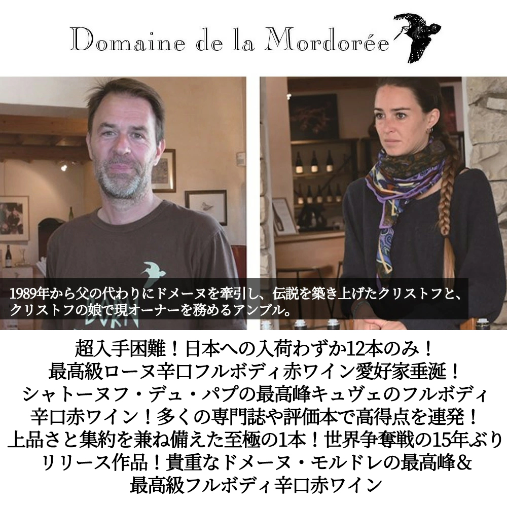造り手は、ロバート・パーカー5つ星生産者で、世界のワイン愛好家から渇望されるシャトーヌフの大人気生産者ドメーヌ・ド・ラ・モルドレ!2015年6月に当主クリストフ・デロルム氏が、まだ52歳という若さで急死され、世界のワイン業界に悲報が入りました!その後、亡クリストフ氏にワイン造りを教えた人物、彼の父親のフランシス・デロルム氏がワイン造りを引き継ぎ、この素晴らしいヴィンテージを完成!