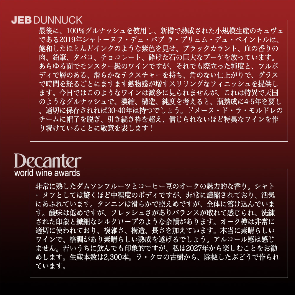 シャトーヌフ・デュ・パプ ・ラ・プリュム・デュ・パントル [2019]年・蔵出し限定作品・ドメーヌ・ド・ラ・モルドレ 元詰・AOCシャトーヌフ・デュ・パプ ・「ジェブ ダナック.com」98+点、「デカンター 2025.2.11」97 点、「ヴィノス 2024.6」95点 ・ラクロー畑100%のグルナッシュ種100%・3度目15年ぶりの造り手最高峰&最高級リリース作品・日本入荷わずか12本のみ・アルコール度数驚異の16%