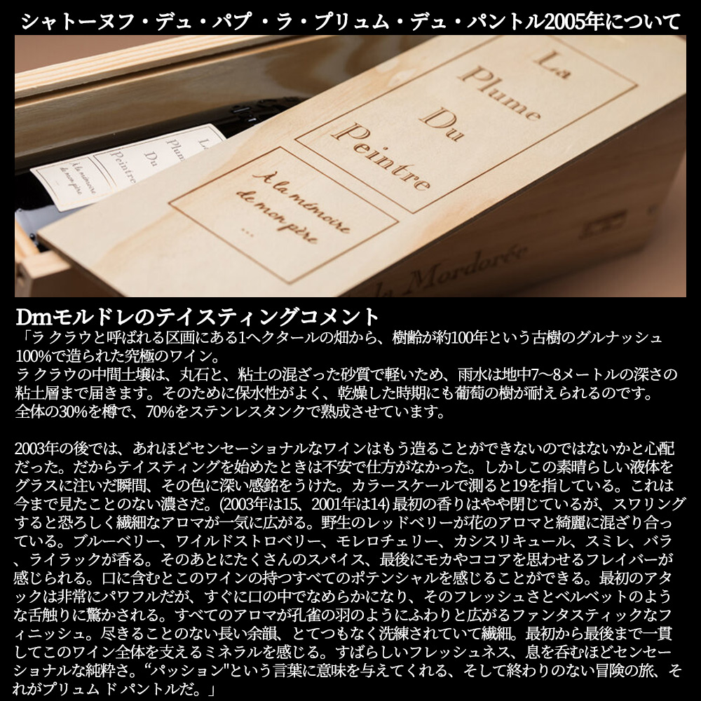 あの伝説の醸造家亡きクリストフ・デロルム氏も一番お気に入りワインがこのシャトーヌフ・デュ・パプだった!最高のシャトーヌフ・デュ・パプから生み出される卓越したキュヴェ!ドメーヌの最高峰&最高級キュヴェ!ラ・プリュム・デュ・パントル!アンブルの父、クリストフの時代に初めて生産された偉大なキュヴェです。ファーストヴィンテージは2003VTでした。その後、2005VTにも生産されましたが、それ以来しばらく生産されていませんでした。アンブルは、「シャトーヌフ デュ パプのラ プリュム デュ パントルをリリースするのはものすごく勇気がいることですが、2019VTのこのキュヴェが素晴らしい味わいだったので、熟成させてラ プリュム デュ パントルとしてリリースしようと決めました」と話します。なんと!2019VTがドメーヌの3度目のリリースとなりました。表ラベルの下部には「父を偲んで……(A la memorie de la mon pere...)」と記載されています。シャトーヌフ デュ パプで最も優れた畑として知られる「ラ クロー」のグルナッシュを100%使用しています。2019VTの生産本数はごくわずかで2,330本のみです。そのうち、日本への輸入本数は12本しかありません。しかも南ローヌの生産者が口を揃えて偉大なグレイト!と絶賛する大人気ヴィンテージ[2019]年! (ワインアドヴォケイト誌ではシャトーヌフに96点のグレイトヴィンテージ評価!) 世界中のワイン愛好家から渇望される、幻のフルボディ赤ワイン!
