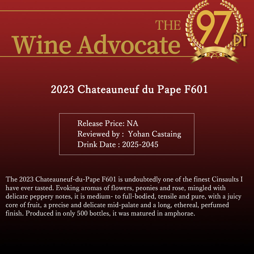 ジェブダナックからも驚異の96点で『1928年に植樹されたブドウから造られた2023年産シャトーヌフ・デュ・パプ F601(サンソー100%)は、全房40%で醸造され、単一のアンフォラで熟成されました。スモーキーな黒果実、ローストハーブ、リコリス、プロヴァンス風スパイス、そしてほのかなタプナードの香りが漂い、複雑で繊細なアロマが美しく調和しています。ミディアムボディからフルボディで、凝縮感があり、重層的な味わいです。上質なタンニン、美しい純粋さ、そしてフィネスが感じられます。2回試飲しましたが、一貫した味わいでした。96点』と激賞!!!