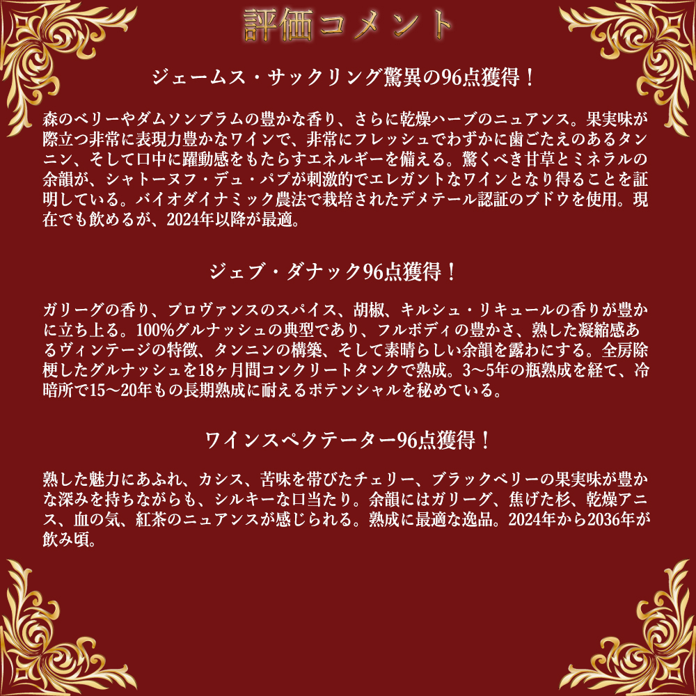ジェブ・ダナック96点でコメントは『ガリーグの香り、プロヴァンスのスパイス、胡椒、キルシュ・リキュールの香りが豊かに立ち上る。100%グルナッシュの典型であり、フルボディの豊かさ、熟した凝縮感あるヴィンテージの特徴、タンニンの構築、そして素晴らしい余韻を露わにする。全房除梗したグルナッシュを18ヶ月間コンクリートタンクで熟成。3~5年の瓶熟成を経て、冷暗所で15~20年もの長期熟成に耐えるポテンシャルを秘めている。』!