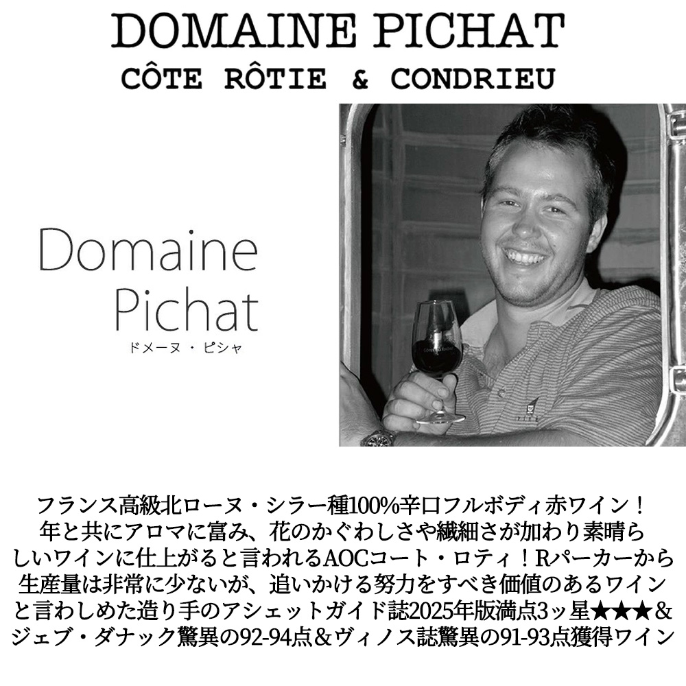 このコート・ロティ・ シャンポン[2023]年・蔵出し作品・ドメーヌ・ピシャ元詰でアシェットガイド誌2025年版満点3ッ星★★★&ジェブ・ダナック驚異の93-95点&ヴィノス誌驚異の91-93点獲得!シャンポン、プロンブ、グランド・プラスの3区画のシラー種100%を使用!