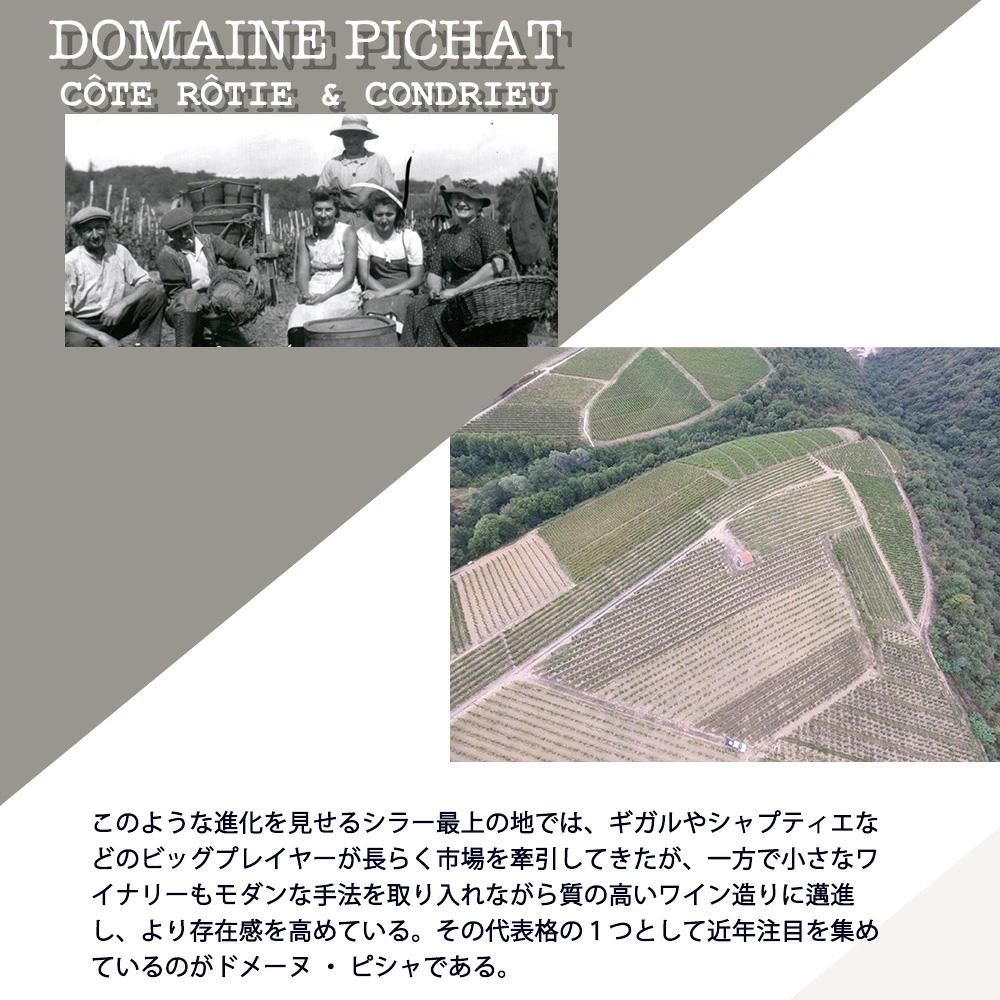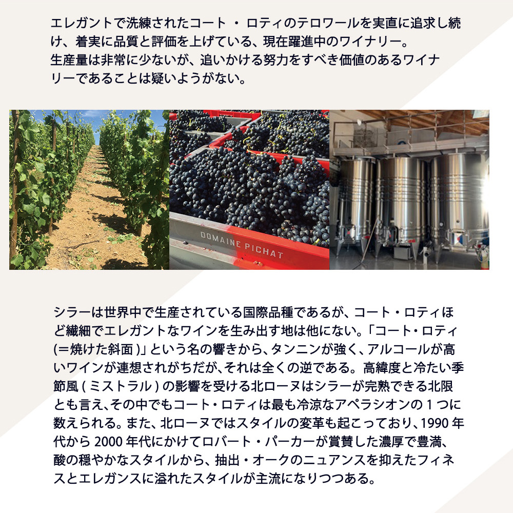 以下インポーターさんのコメントは『シラーは世界中で生産されている国際品種であるが、コート・ロティほど繊細でエレガントなワインを生み出す地は他にない。「コート・ロティ(=焼けた斜面)」という名の響きから、タンニンが強く、アルコールが高いワインが連想されがちだが、それは全くの逆である。高緯度と冷たい季節風(ミストラル)の影響を受ける北ローヌはシラーが完熟できる北限とも言え、その中でもコート・ロティは最も冷涼なアペラシオンの1つに数えられる。また、北ローヌではスタイルの変革も起こっており、1990年代から2000年代にかけてロバート・パーカーが賞賛した濃厚で豊満、酸の穏やかなスタイルから、抽出・オークのニュアンスを抑えたフィネスとエレガンスに溢れたスタイルが主流になりつつある。このような進化を見せるシラー最上の地では、ギガルやシャプティエなどのビッグプレイヤーが長らく市場を牽引してきたが、一方で小さなワイナリーもモダンな手法を取り入れながら質の高いワイン造りに邁進し、より存在感を高めている。その代表格の1つとして近年注目を集めているのがこのドメーヌ・ピシャ。ファーストヴィンテージは2000年で全生産本数900本のみの生産という規模で始まったドメーヌ!しかもなんと!コート・ロティの神髄とも言えるアンピュイ村に畑を所有。アンピュイ村の代表的な畑の1つであるレ・グランド・プラスは、ロバート・パーカー氏が「ローヌワイン」の中で「ギガルの三銃士と並びコート・ロティの中で最も深遠なワイン」として挙げている程の偉大な畑。アンピュイ村にワイナリーを構えるドメーヌ・ピシャでは、名高いレ・グランド・プラスをはじめ、シャンポン、プロンブなど大部分の畑をアンピュイに所有!』