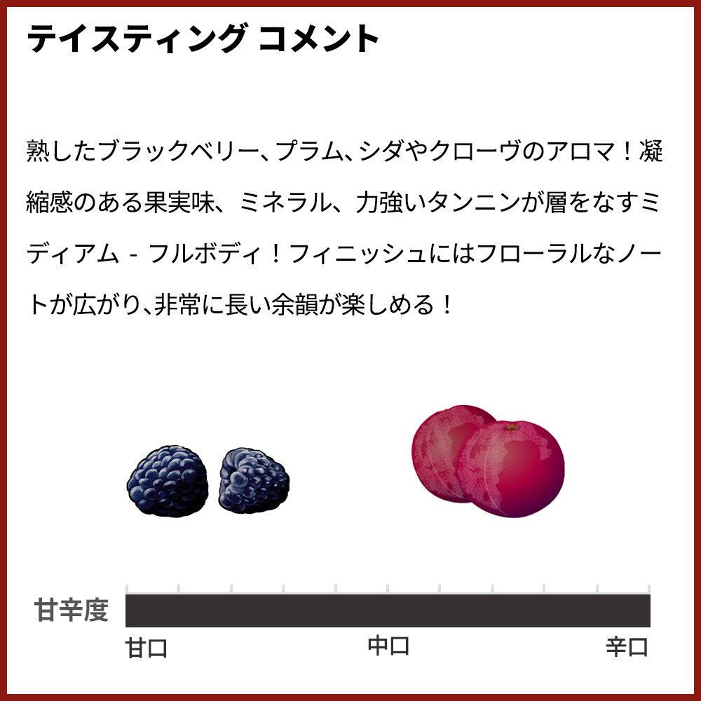 熟したブラックベリー、プラム、シダやクローヴのアロマ!凝縮感のある果実味、ミネラル、力強いタンニンが層をなすミディアム-フルボディ!フィニッシュにはフローラルなノートが広がり、非常に長い余韻が楽しめる!もちろん現地のセラー数ヶ月前の蔵出し品で限定少量入荷!