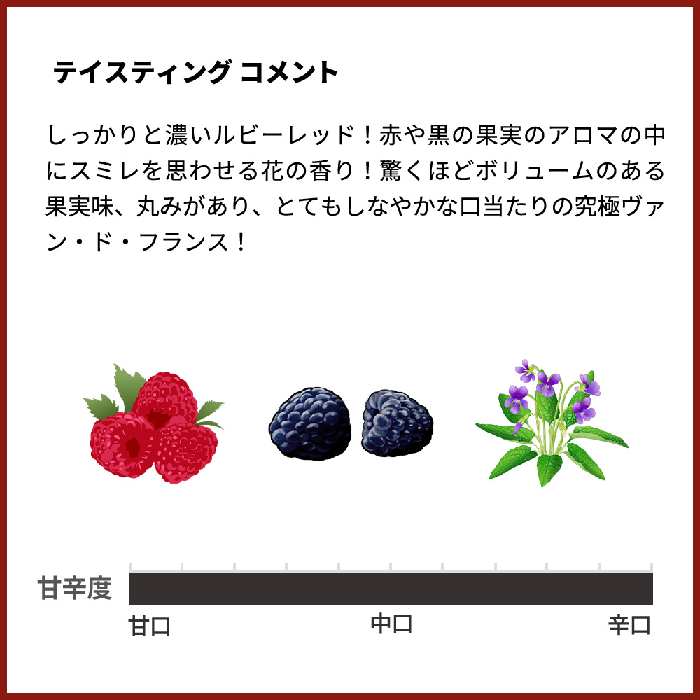 収穫は手摘み100%!全体の60%がフリーラン、40%はプレスジュースを使用!熟成はフレッシュさを残すためステンレスタンクで7ヶ月熟成という超こだわり究極ローヌ辛口赤ワイン!しっかりと濃いルビーレッド!赤や黒の果実のアロマの中にスミレを思わせる花の香り!驚くほどボリュームのある果実味、丸みがあり、とてもしなやかな口当たりの究極ヴァン・ド・フランス!