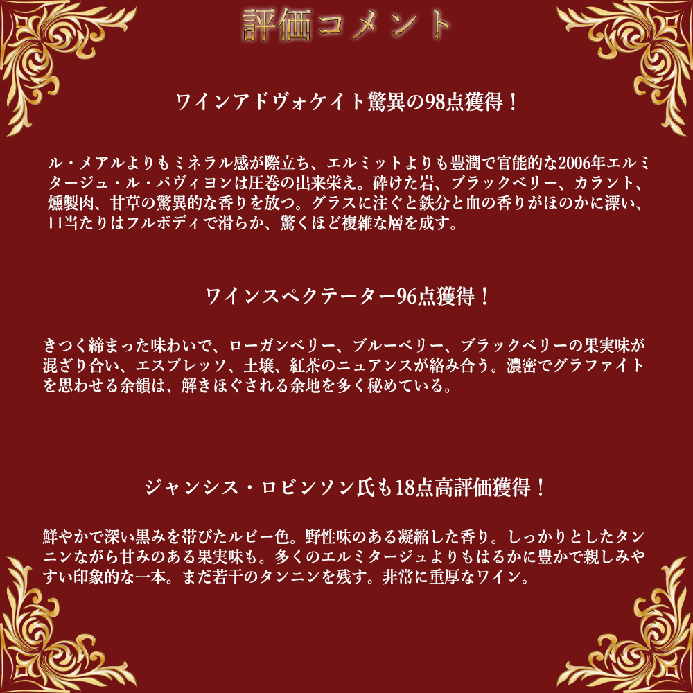 エルミタージュ“ル・パヴィヨン”ルージュ[2006]年でワインアドヴォケイト驚異の98点でコメントは「ル・メアルよりもミネラル感が際立ち、エルミットよりも豊潤で官能的な2006年エルミタージュ・ル・パヴィヨンは圧巻の出来栄え。砕けた岩、ブラックベリー、カラント、燻製肉、甘草の驚異的な香りを放つ。グラスに注ぐと鉄分と血の香りがほのかに漂い、口当たりはフルボディで滑らか、驚くほど複雑な層を成す。」と激賞!