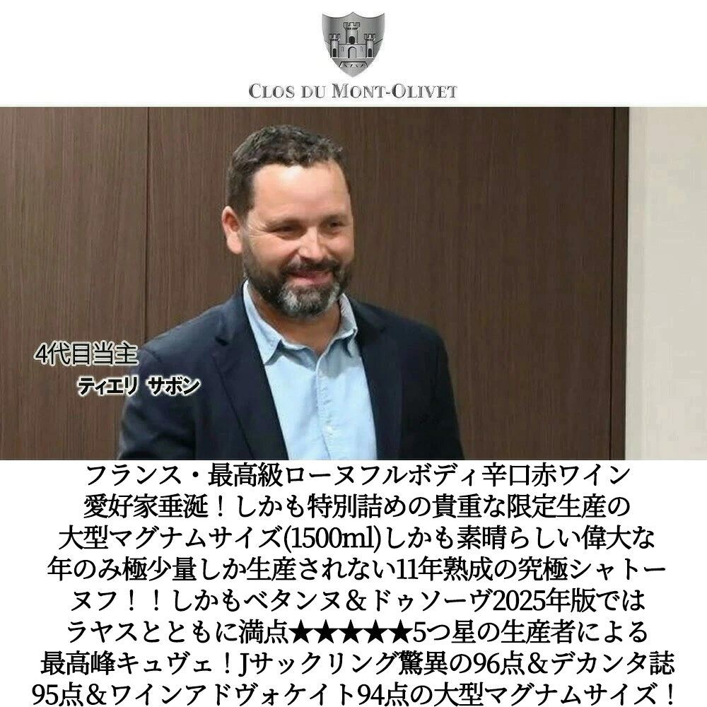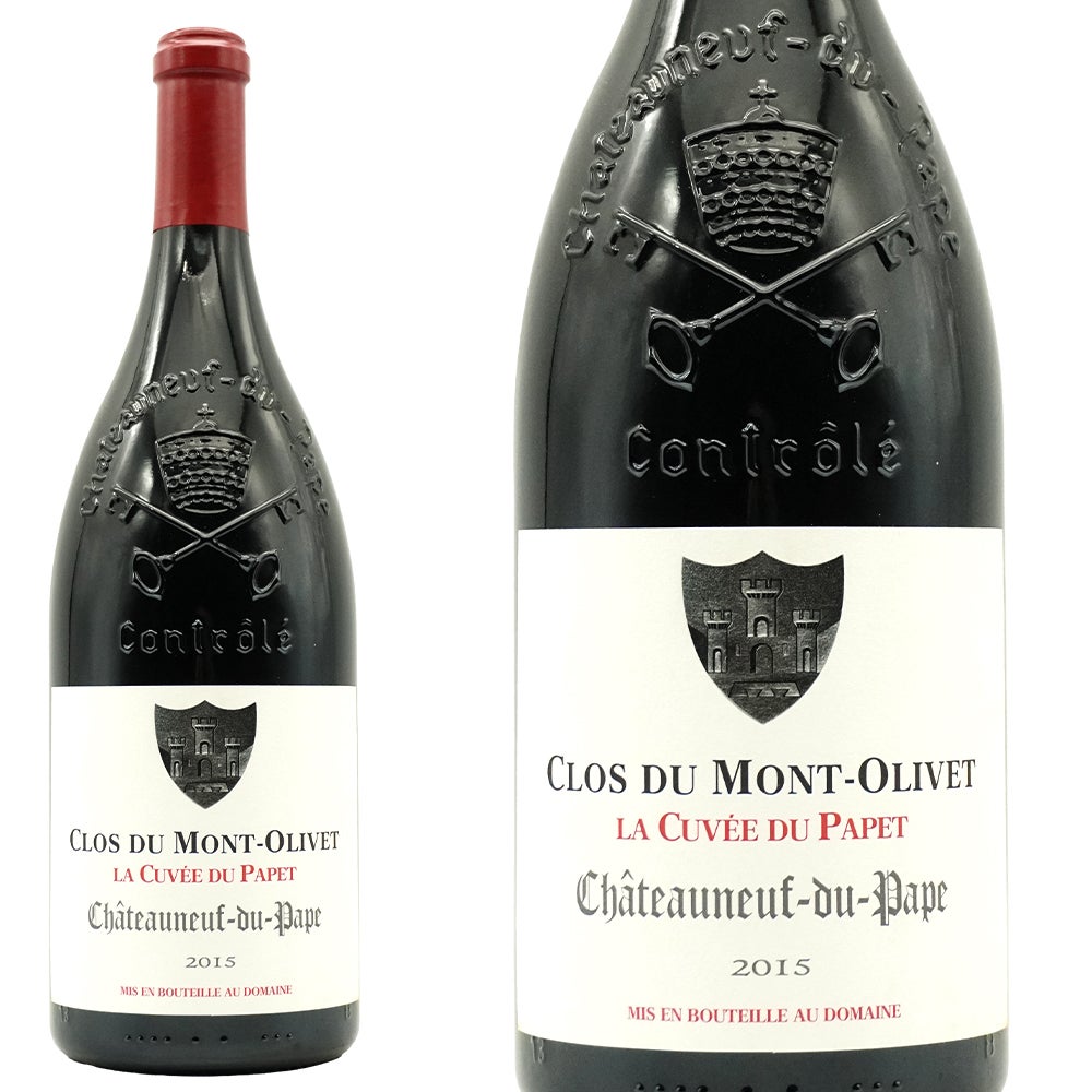 【大型】シャトーヌフ・デュ・パプ・キュヴェ・パペ[2015]年・蔵出し作品・ドメーヌ・クロ・デュ・モン・オリヴェ元詰(ジョセフ・サボン家)・樹齢100年以上のV.V・最高峰キュヴェ・アルコール度数驚異の15%以上・AOCシャトーヌフ・デュ・パプ・11年熟成作品・大型マグナムサイズ・1500ml・1.5L・ジェームス・サックリング驚異の96点&デカンタ誌95点&ヴィノス誌93-95点&ワインアドヴォケイト94点