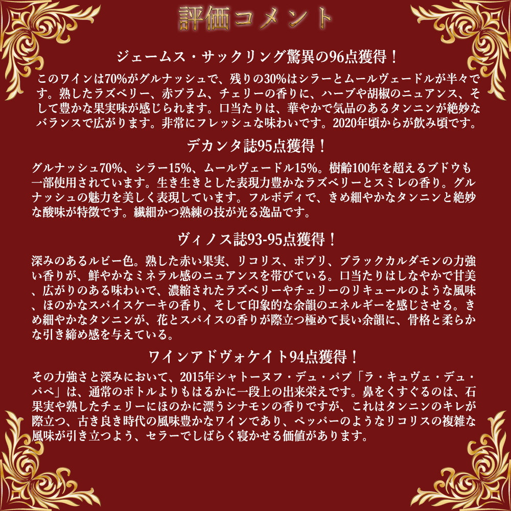 ワインアドヴォケイト94点でコメントは「その力強さと深みにおいて、2015年シャトーヌフ・デュ・パプ「ラ・キュヴェ・デュ・パペ」は、通常のボトルよりもはるかに一段上の出来栄えです。鼻をくすぐるのは、石果実や熟したチェリーにほのかに漂うシナモンの香りですが、これはタンニンのキレが際立つ、古き良き時代の風味豊かなワインであり、ペッパーのようなリコリスの複雑な風味が引き立つよう、セラーでしばらく寝かせる価値があります。」と激賞!