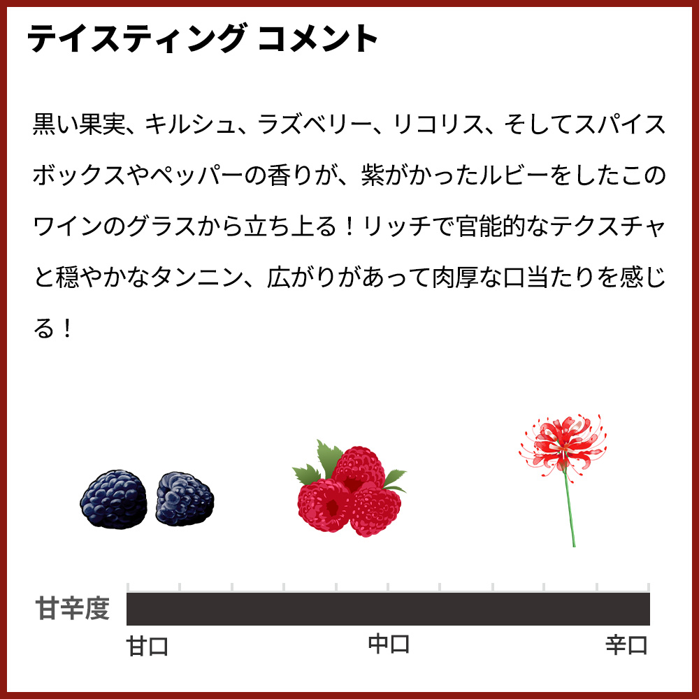 ヴィノス誌93-95点でコメントは「深みのあるルビー色。熟した赤い果実、リコリス、ポプリ、ブラックカルダモンの力強い香りが、鮮やかなミネラル感のニュアンスを帯びている。口当たりはしなやかで甘美、広がりのある味わいで、濃縮されたラズベリーやチェリーのリキュールのような風味、ほのかなスパイスケーキの香り、そして印象的な余韻のエネルギーを感じさせる。きめ細やかなタンニンが、花とスパイスの香りが際立つ極めて長い余韻に、骨格と柔らかな引き締め感を与えている。」!
