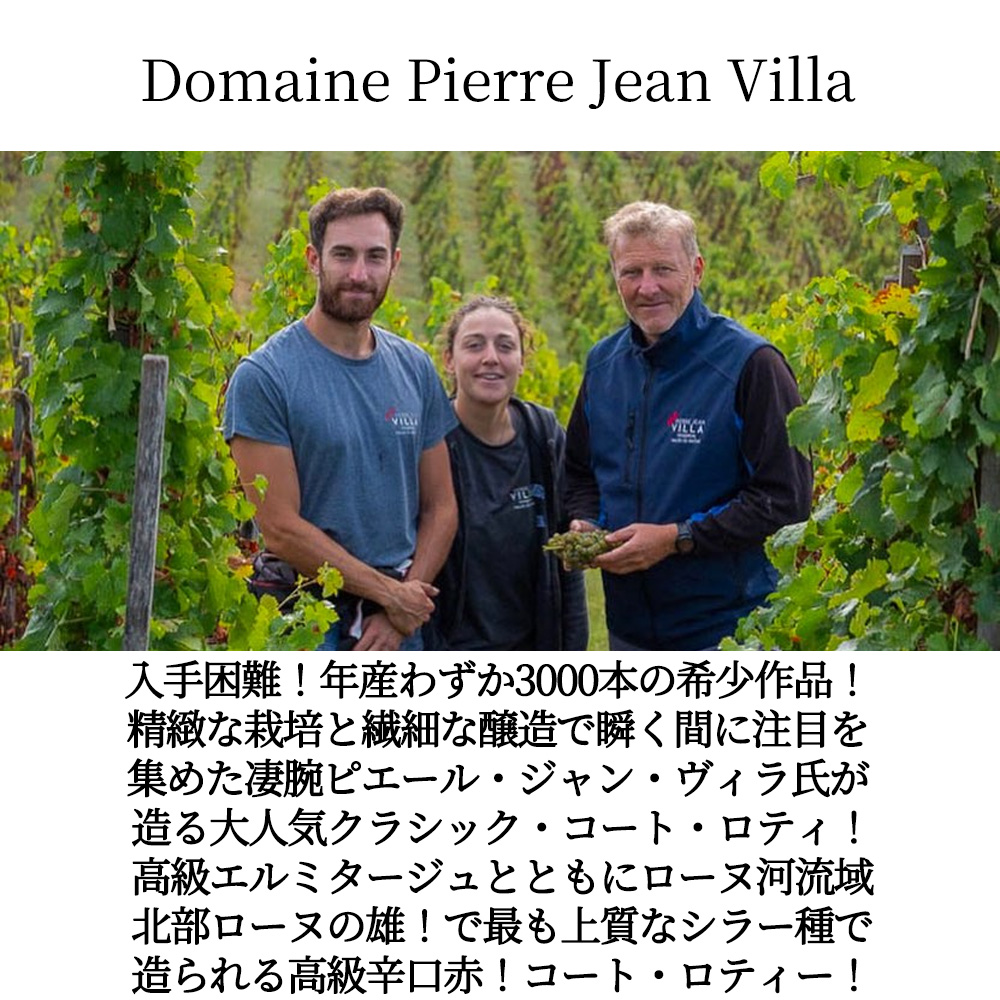 造り手についてインポーターさんは「ドメーヌ・ピエール・ジャン・ヴィラは北ローヌの中心、ヴィエンヌ近郊に拠点を置く生産者。2009年の設立ながら、精緻な栽培と繊細な醸造で瞬く間に注目を集めた。ピエール・ジャン・ヴィラはアンドレ・ペレやフランソワ・ヴィラールらとともに「ヴィニュロン・ド・ヴィエンヌ」を設立、その後アート・ヴィンサンのもとで働き、2009年に独立。コート・ロティを中心にサン・ジョセフ、コンドリュー、サン・ペレなど主要クリュを網羅している。2022年に完成した新セラーの導入により醸造精度とピュアリティが飛躍的に向上。自然酵母での発酵、月齢カレンダーに基づく醸造、極小限のSO2使用など、テロワールの表現を最も重視したスタイルを追求。2011年からビオロジック栽培を実践し、2021年に正式認証を取得。現在は子供のマリーヌとポールがドメーヌ運営に加わり、ビオディナミへの移行を進めている。2023年は北ローヌ全域で比較的冷涼な気候となり、成熟期の夜間の温度が低く保たれたことで酸が引き締まり、香りに緊張感と精密さが備わった。開花期の不安定な天候による収量の減少はあったが、収穫時には健全な果実が得られ、繊細で端正なスタイルに仕上がっている。シラーは引き締まったタンニンとフレッシュな酸を持ち、エレガントな仕上がり。白は骨格と伸びがあり、余韻にミネラルが残る。テロワールに忠実で、果実の純度と酸の美しさ、そしてエレガンスと生命感を兼ね備えたドメーヌ。それが、今日のピエール・ジャン・ヴィラの真骨頂である。」!