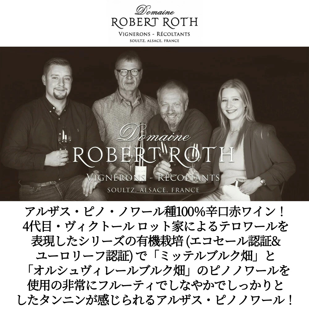 フランス・アルザス・ピノ・ノワール種100%フルボディ辛口赤ワイン愛好家大注目!自然派・ビオロジック・ (エコセール認証&ユーロリーフ認証) アルザス・ピノ・ノワール愛好家大注目!なんと!ロベール ロットの主に「ミッテルブルク畑」と「オルシュヴィレールブルク畑」という2ヶ所のリュー ディの樹齢の若い葡萄・ピノノワール100%を使用、この地ならではのテロワールを表現したシリーズのピノノワール種100%! (主に「ミッテルブルク」と「オルシュヴィレールブルク」という2ヶ所のリュー ディのピノノワールを使用したしなやかでしっかりとしたタンニンのアルザス・ピノノワール。)