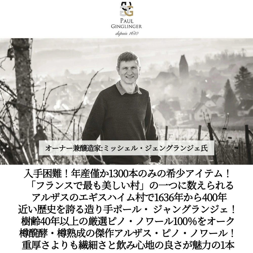 入手困難!アルザス・ピノ・ノワール愛好家大注目!年産僅か1300本のみの希少アイテム!ピュアで美しい果実味が魅力の樽醗酵・樽熟成のアルザス・ピノ・ノワール!「フランスで最も美しい村」の一つに数えられるアルザス有数の美観、美食の街と知られるエギスハイム村 (エギスハイムは、フランス北東部アルザス地方のオー=ラン県にある村で、コルマールの南西約5kmに位置します。アルザスワイン街道沿いの、ブドウ畑に囲まれた村として知られています。土壌は主に石灰質系で、第三紀の礫岩・泥灰土を基盤に、場所によって砂岩や粘土石灰質土壌が見られます。特にグラン・クリュのアイシュベルクは、石灰が少なく砂岩を多く含む区画があり、これがワインの骨格とエレガンスに寄与するとされています。) で1636年から400年の歴史を誇る造り手!アイシュベルグとペルシベルグの2つのグラン・クリュを所有!現在は、2000年にドメーヌを継いだ13代目のミッシェル氏とその妻ロレットが中心となりワイナリーを運営!