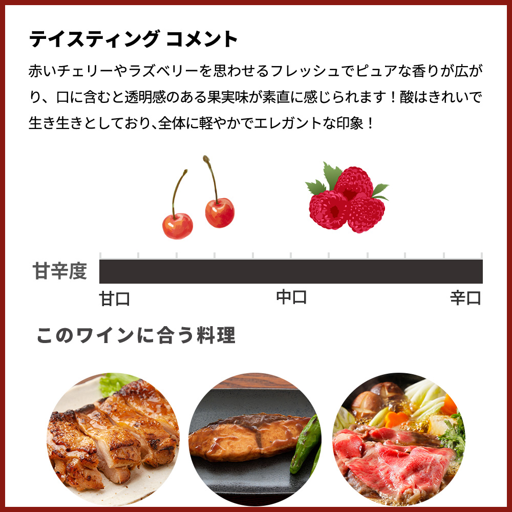 赤いチェリーやラズベリーを思わせるフレッシュでピュアな香りが広がり、口に含むと透明感のある果実味が素直に感じられます!酸はきれいで生き生きとしており、全体に軽やかでエレガントな印象!タンニンは穏やかで滑らか、過度な樽の主張はなく、果実の純度が前面に出ています!余韻にはほのかなスパイスや土っぽさが感じられ、ナチュラルでバランスの良い仕上がり!重厚さよりも繊細さと飲み心地の良さが魅力の一本!オーク樽醗酵&熟成の傑作アルザス・ピノ・ノワールが限定で少量入荷!鶏のロースト、鴨、豚肉料理、和食 (照り焼き、すき焼き軽め) と相性抜群!