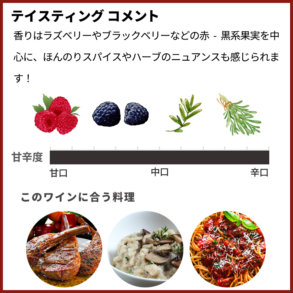 香りはラズベリーやブラックベリーなどの赤-黒系果実を中心に、ほんのりスパイスやハーブのニュアンスも感じられます!口当たりはフレッシュでジューシー、タンニンは柔らかく重すぎないミディアムボディ!澱由来のわずかなコクと滑らかなテクスチャーがあり、果実味の豊かさと軽快さのバランスが良いのが特徴!酸味は程よく、後味はクリーンで飲みやすく、食事と合わせやすいカジュアルなスタイルのミディアムボディ辛口赤ワイン!