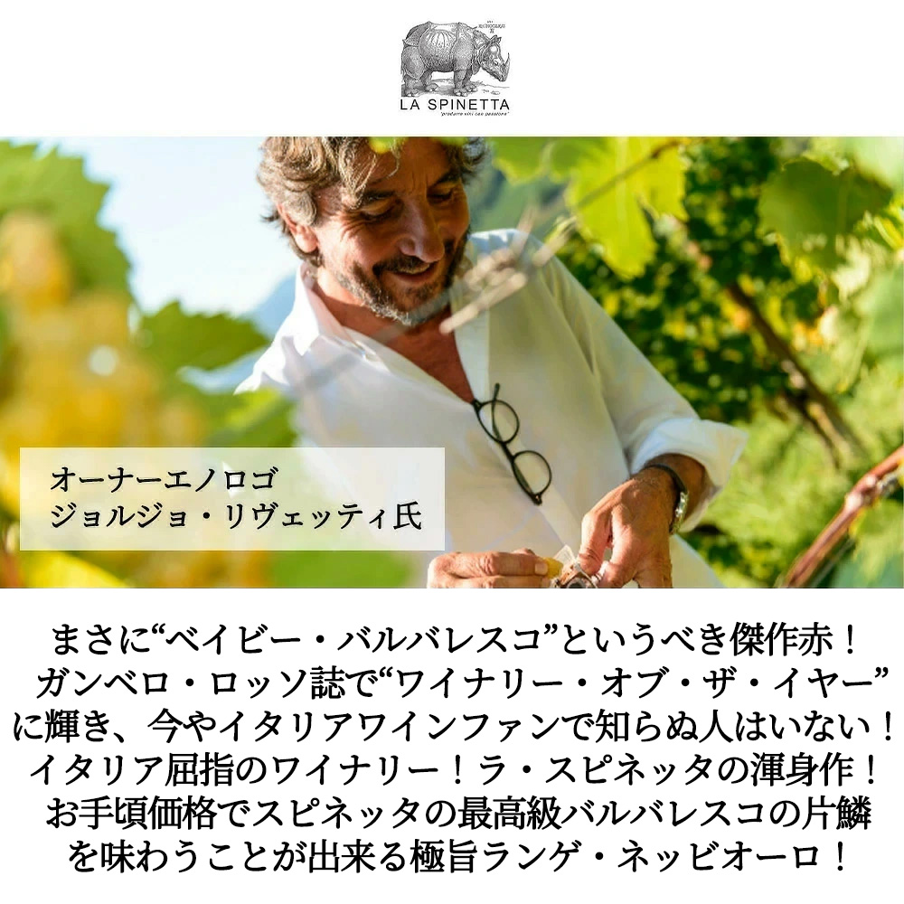 造り手は、ガンベロ・ロッソ誌で“ワイナリー・オブ・ザ・イヤー”に輝き、今やイタリアワインファンで知らぬ人はいない!イタリア屈指のワイナリー!ラ スピネッタ(元バローロボーイズのラ・スピネッタ!ラ・スピネッタ社のワインを彩るのは、ドイツ・ルネッサンスの偉大な画家Albrecht(アルブレヒト)、Durer(デューラー)(1471-1528)のサイのエチケットで有名。)ジョルジョ・リヴェッティ氏を中心に、妥協を許さないワイン造りへの情熱が、バルベーラ、バルバレスコ、そしてバローロなどの素晴らしいワインを生み出しており、2019年現在、ガンベロ・ロッソにおいてイタリア全土で3番目に多い、38のトレ・ビッキエーリを獲得する快挙!