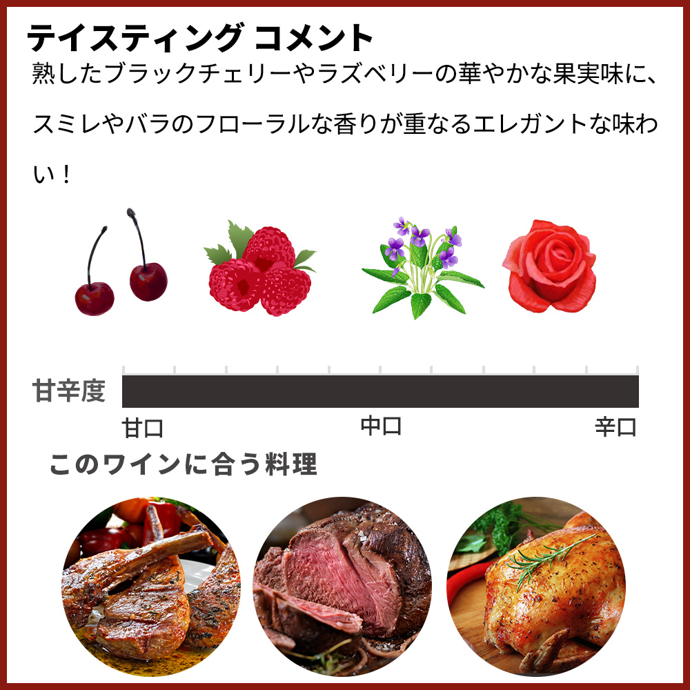 熟したブラックチェリーやラズベリーの華やかな果実味に、スミレやバラのフローラルな香りが重なるエレガントな味わい!口当たりは滑らかで、ネッビオーロらしいタンニンは感じられるもののきめ細かく、強すぎずバランス抜群!樽由来のほのかなスパイスやカカオのニュアンスもあり、余韻には軽い土っぽさと心地よい苦味が残ります!全体としてフレッシュさと奥行きを兼ね備え、若いうちから楽しめる親しみやすいスタイル!